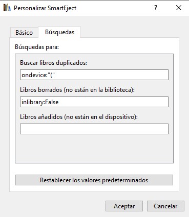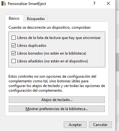 Which is your configuration for SmartEject? This is mine (in Spanish) and only complains when there are books only on device (this configuration is tricky: the search for duplicated books really searches books only on device):