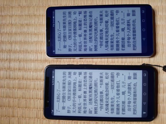 The A5 is on the left in the photos. They were taken inside in the middle of the day with just the natural light coming in through the window. One photo was taken with the frontlight at 100% on both models. The other was taken with the frontlight off on both models. They were both opened to the same page of the same ebook in Moon+ Reader Pro. All settings were the same. |
