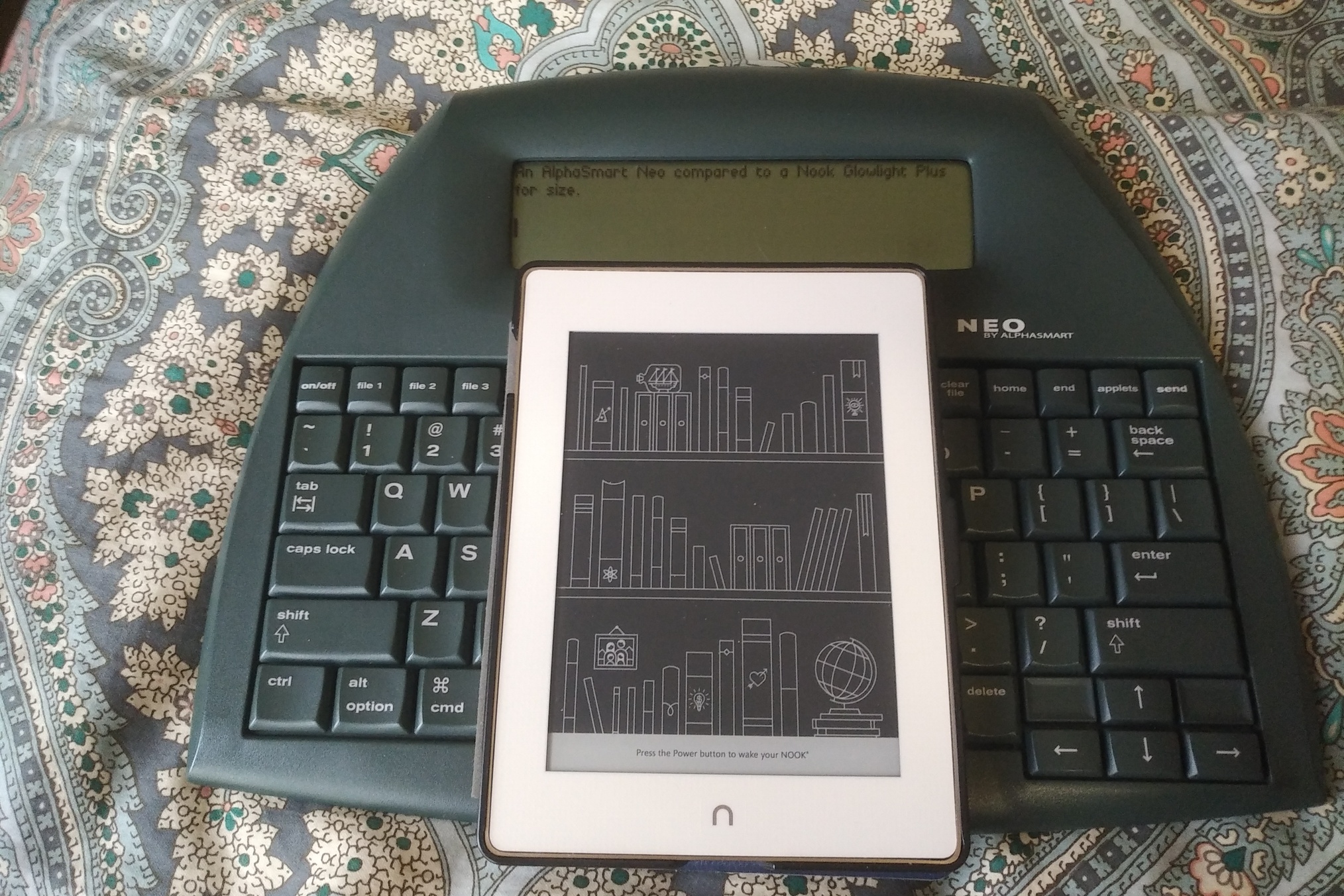 Pictures should make what I'm trying to say clearer. Comparing a Nook Glowlight Plus with an AlphaSmart Neo. You'll note the Neo's screen is wider than the Nook's screen is high or wide.