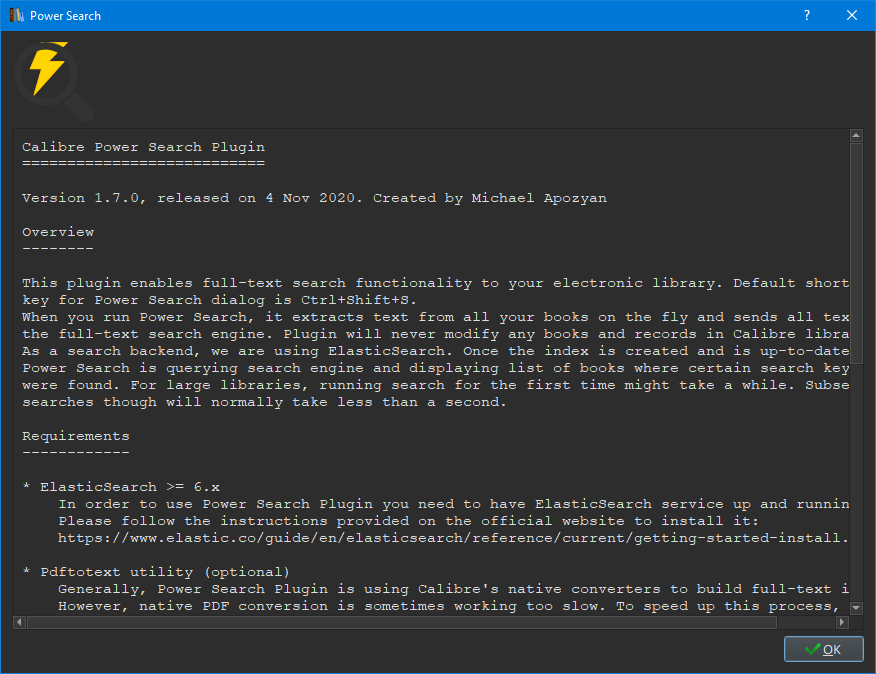 1. An option to set the path for ElasticSearch, so that if it isn't running it can launch it instead of just throwing an error about being unable to contact the service. 2. Being able to search only the currently viewed (or selected, if that's more doable) books. This could be added as a dropdown menu. 3. On the topic of the menus, the icon is extremely low-contrast in dark mode (I only just realized there's a magnifying glass). An alternate icon for dark mode would be nice. Thank you! Last edited by ownedbycats; 01-04-2021 at 07:26 PM. |