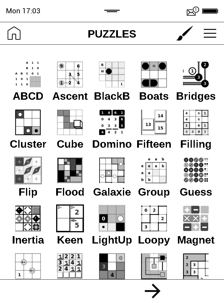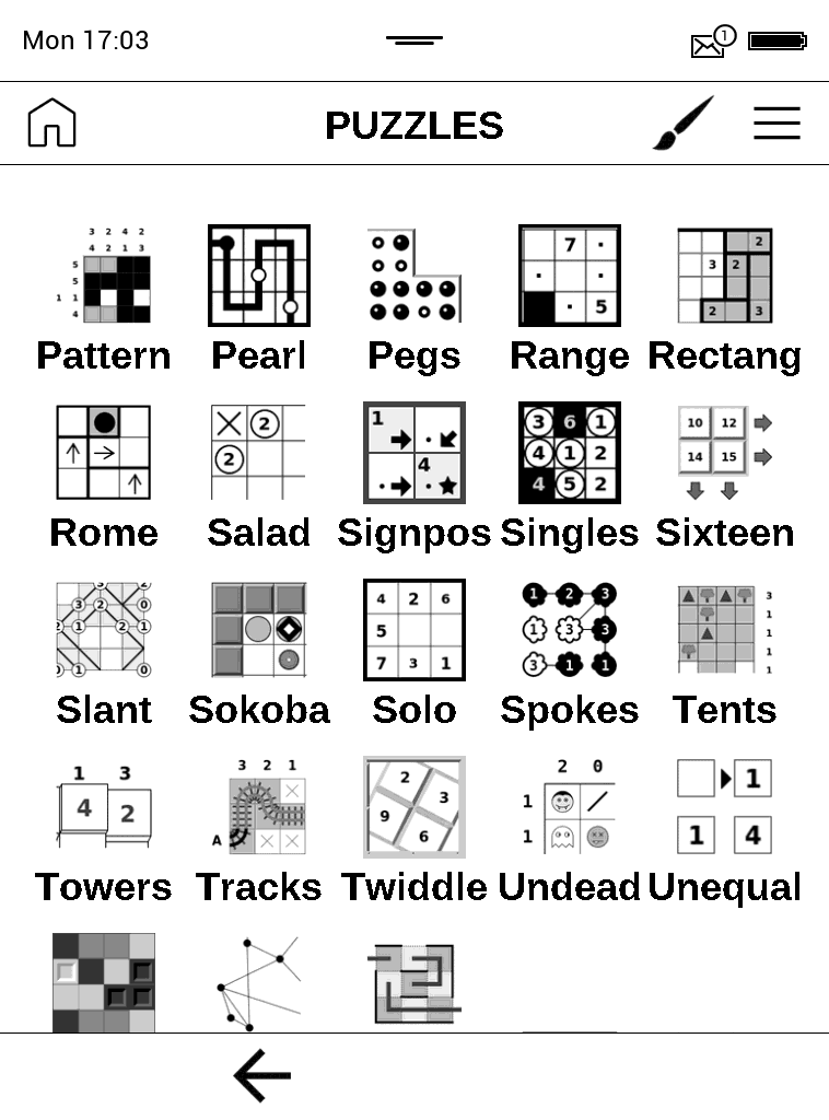 Hi, I used the corona lockdown time to port the famous Simon Tatham's Portable Puzzle Collection to my Pocketbook Touch HD 3. This week I finally implemented the last missing element needed for a beta relase, and like to share it now: https://github.com/SteffenBauer/PocketPuzzles Ready compiled binary apps (installation of course on own risk) can be found here: https://github.com/SteffenBauer/Pock...ease/README.md I ported a total of 50 puzzles, including a sudoku with many variations, minesweeper, slitherlink, and dozens of other less known logic puzzles. Released under the MIT license, so completely free and open source, I have no commercial interest at all, only personal enthusiasm. If anybody finds bugs or has ideas for improvement, please comment here, or open an issue at GitHub. I'm especially interested in reports how the app is working on devices other than the Touch HD 3, like if the screen layout is still ok etc. So far, I received reports that the app works with these devices: PB632 - Touch HD 3 PB631 - Touch HD / Touch HD 2 PB740 - InkPad 3 PB633 - Pocketbook Color PB1040 - InkPad X PB626 - Touch Lux 3 PB628 - Touch Lux 5 Optimized for a Touch HD 3 with screen resolution of 1072x1448 pixels. The app works on devices with a different screen resolution, but some UI elements might look slightly different. Thanks a lot to the mobileread forum members nhedgehog, EastEriq, ezdiy, and rkomar for helping me with my questions regarding PocketBook app development in the Developer's corner! Last edited by GerReader; 04-02-2022 at 04:23 PM. Reason: Next version ready |