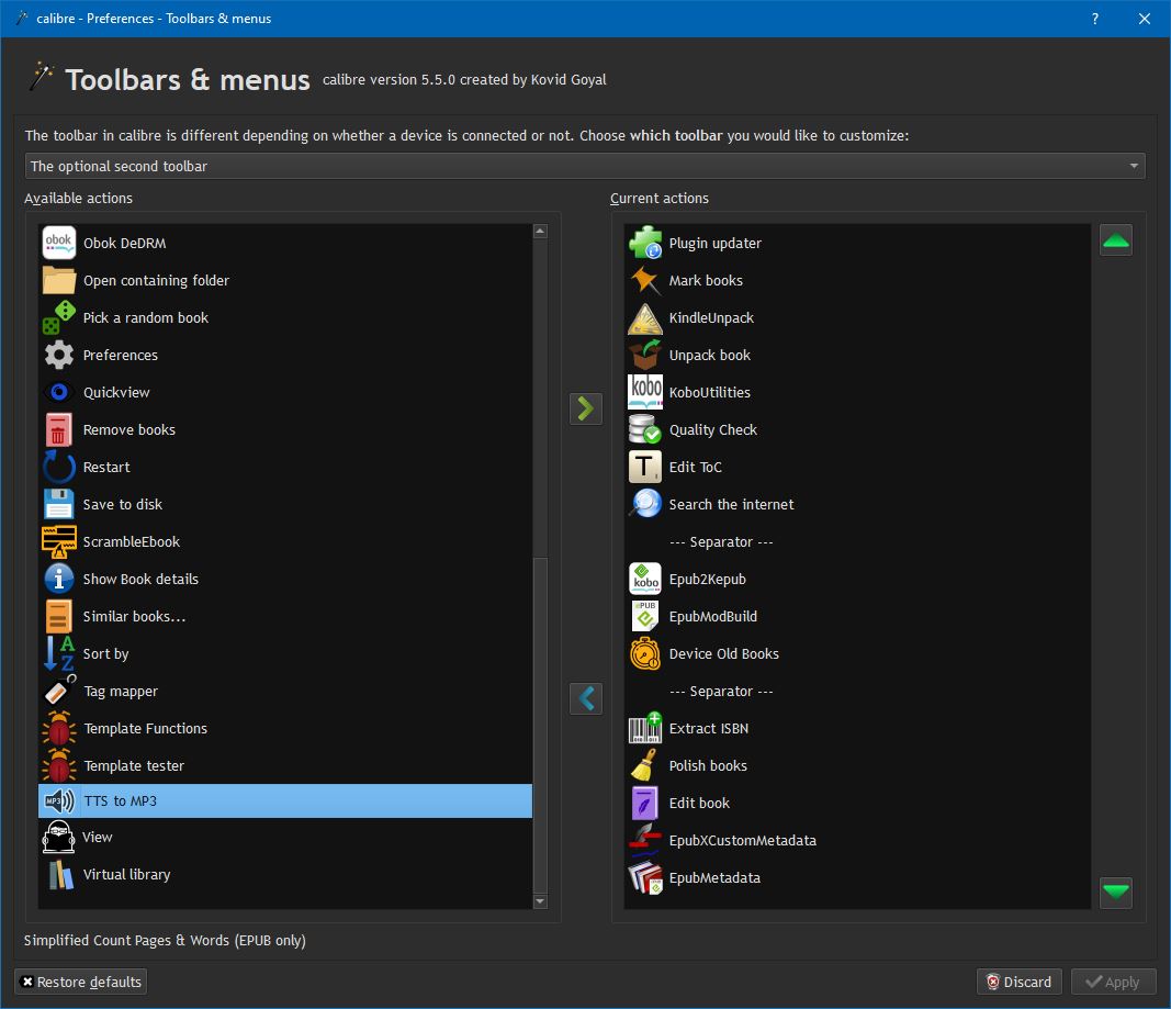 When I installed the plug-in this does not appear on the toolbar (Caliber 5.5) , in the previous version neither I appeared and there is no way to add it to the toolbar and menus as it does not appear as an available action either. I have more add-ons installed and this is the only one that gives me that problem. I am using the latest version of 64-bit Caliber and the latest version of Windows 10 Pro. In much older versions I did not have this problem so I think the problem is not in my computer. Please help. Thank you.