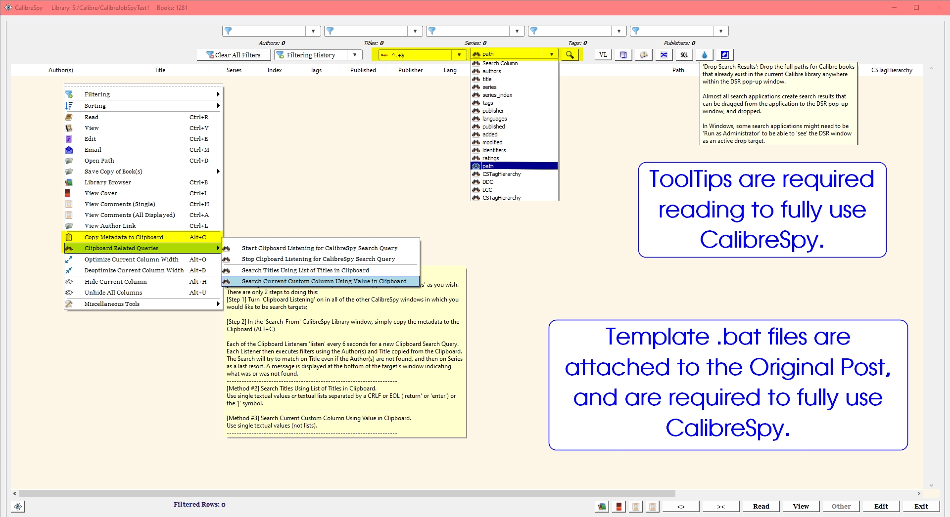 If so, that is a big ask, since CalibreSpy does not use Calibre's gui or guidb or gprefs or server or any other "live" part of Calibre. CalibreSpy is explicitly designed to run when Calibre is not running at all, anywhere, in any way, since CalibreSpy was intended to be run from a .bat file multiple times simultaneously using only Calibre's metadata.db as a stand-alone SQLite database. Could you clarify your request, and explain exactly how and when you would theoretically use what was copied to the OS clipboard from CalibreSpy? Also, how that is not redundant with performing CalibreSpy multi-Library searches for matching books using "Clipboard Search Queries" while simultaneously viewing multiple Libraries in CalibreSpy as shown in this video example from 2018: https://www.mobileread.com/forums/attachment.php?attachmentid=166302&d=1536956413 As well, CalibreSpy has my Drop Search Results plugin embedded with the DSR icon shown in the CS window. Simply Drag a book's textual path from any source that supports Dragging to the CS DSR icon. Or, simply copy a books partial path found anywhere into the CalibreSpy Regular Expression Search box, click the binocular icons for "path", and it will filter based on that search. Or,... DaltonST Last edited by DaltonST; 12-06-2020 at 01:03 PM. Reason: "Clipboard Search Queries" |