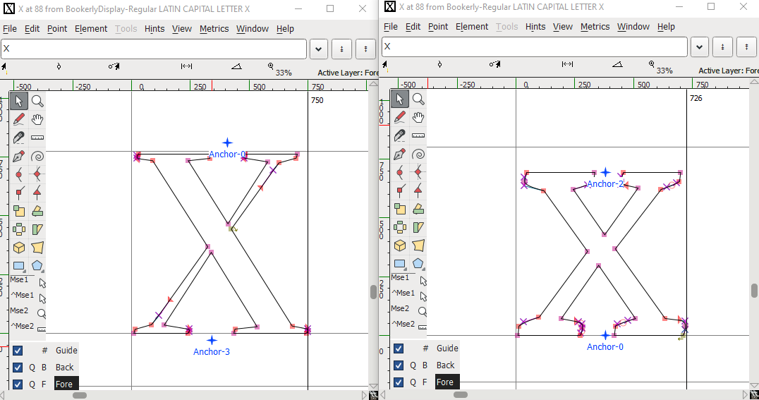 Personally, I find the slab serfs in Bookerly to be a bit more attractive than the didone/modern serifs in Bookerly Display. Looking at the capital A, M, N, U, V, W, X and Y, I also dislike the difference in the slanted lines typical of a didone/modern serif typeface. I've attached an image of the capital X in both open in FontForge.