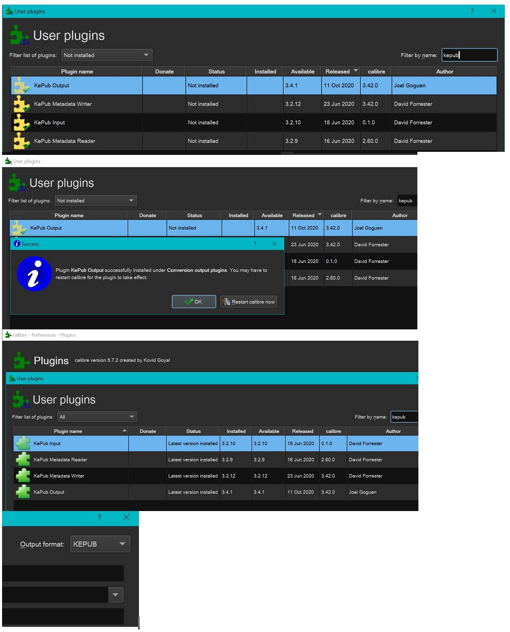 OK, there's an interesting new development. It turned out that "removing" the 5.7.2 install via the MSI and reinstalling it did change the version number to 5.7.2 - but it also removed ALL kepub plugins. By default, I convert all books to kepub before sideloading onto my Libra, which is how I noticed the absence (image 1). I reinstalled the kepub output, and restarted, all seemed fine (image 2). But after shutting Calibre down and restarting, it reverted to 5.7.0. as in image 3