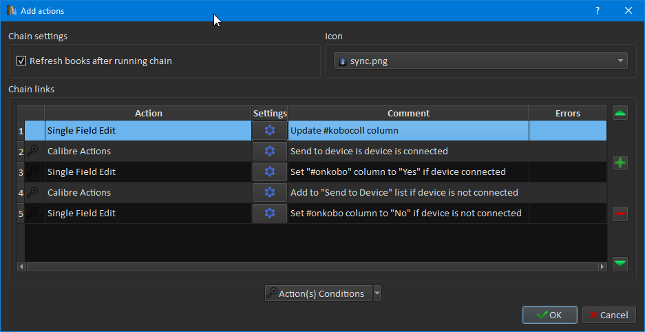 The Conditions Dialog can be used to set conditions on chains or actions. If these conditions are not met, the action/chain will not run. Conditions are made possible by leveraging the powerful yet simple calibre template language. For more on templates, visit this link.