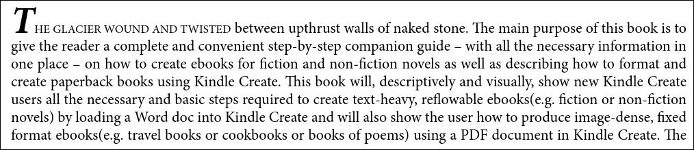 <p class="first"><span class="stand">T</span><span class="small">HE GLACIER WOUND AND TWISTED</span> between upthrust walls of naked stone. p{margin:0;text-align:justify;} .small{font-size:0.77778em;} .stand{font-size:2.5em;font-style:italic;font-weight:bold;line-height: 1.2rem;} .first{text-indent:0;margin-top:2em;} Convert to AZW, on Kindle, it adds a space proportional to the cap size below the first line: see screen. On ePub was the same, until I added "line-height: 1.2rem;". That fixed the linespacing in ePub, but was ignored in Kindle. Is there a way to fix linespacing that works in Kindle? Last edited by AlanHK; 12-21-2020 at 10:57 PM. |