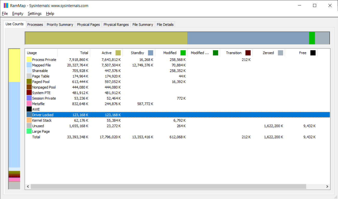 Interesting. On my system, the Device Locked item hits about 125MB at it's peak and drops back to under 50MB rather often. If I run VMWare WorkStation Pro and open multiple VMs, I start consuming memory like it was free and the Driver Locked goes to 123MB which is a pretty small chunk of the 23GB Task Manager shows as being used.