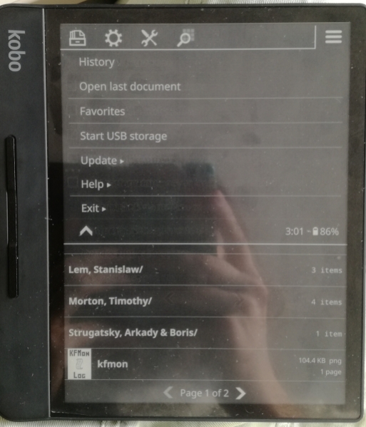 The light on the power button remains off with or without connection, but because I've also dabbled into the setting for the charging light I'm not entirely positive on whether I've turned that off in Nickle. I think I left that setting on, I'm just not 100% sure. E-ink fades over the course of months, right? If it got shorted internally, it would have been at the worst possible moment. On the other hand, does running KOReader void the warranty? I didn't buy it at kobo itself but at a local amazon-like webshop, they might not understand or care about what's on the screen, or be big enough to not be difficult on small fry like this. It's not stuck on some "do not touch these advanced dev buttons" screen. The worst offender is kfmon. This luck of mine is part of why I've avoided buying new devices for years...