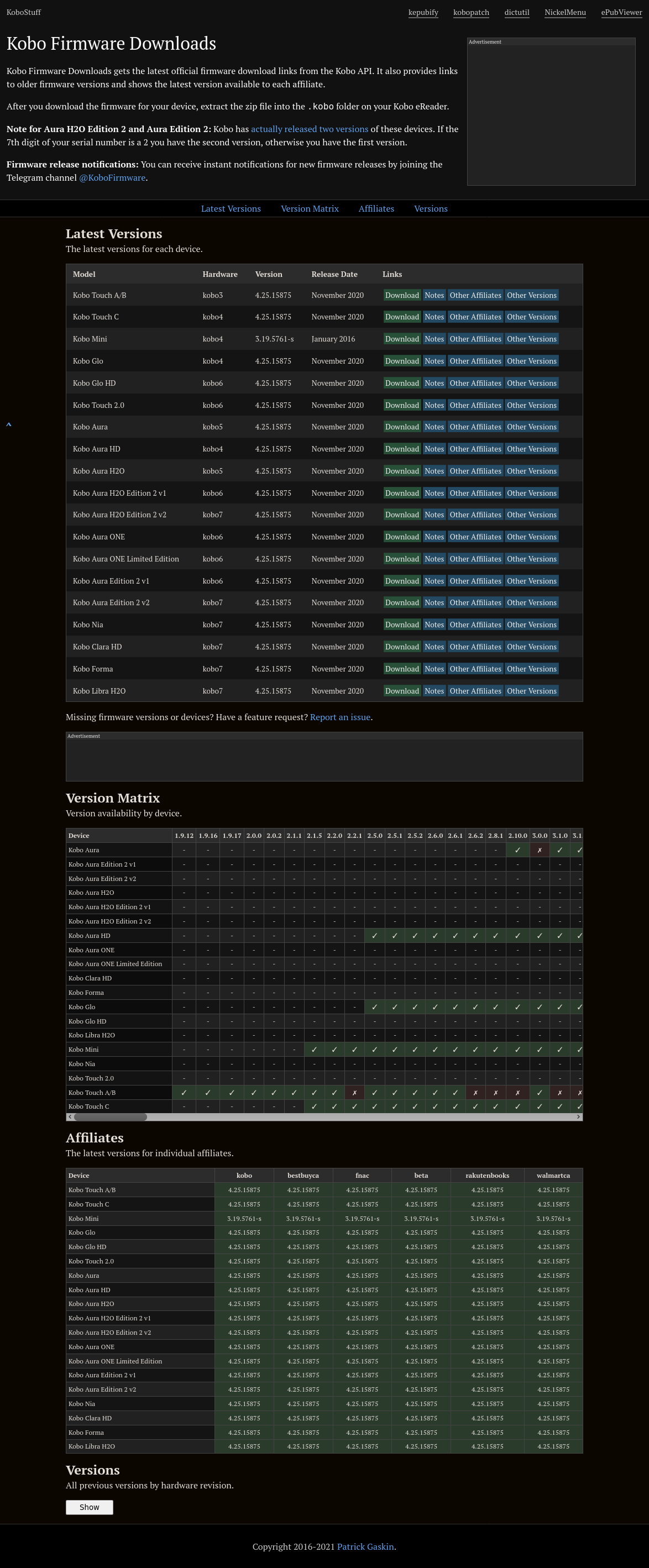 I've finally gotten around to finishing the redesign I've been working on for my Kobo firmware page for a while. It's now cleaner, more compact, and the tables are easier to read. In addition, there's now a dark mode for devices which support it. There's also now a second navbar to quickly jump between sections. Otherwise, the functionality is identical, but I plan on making some performance improvements later to make the page load faster.