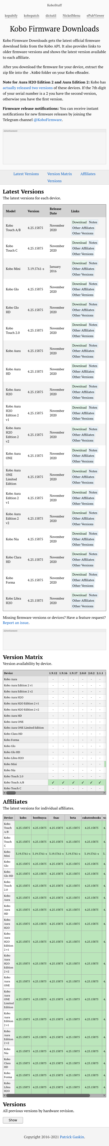 I've finally gotten around to finishing the redesign I've been working on for my Kobo firmware page for a while. It's now cleaner, more compact, and the tables are easier to read. In addition, there's now a dark mode for devices which support it. There's also now a second navbar to quickly jump between sections. Otherwise, the functionality is identical, but I plan on making some performance improvements later to make the page load faster.