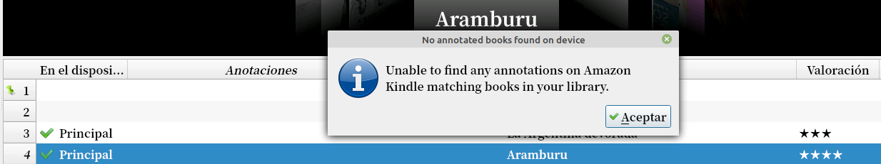 Create a custom column for annotations in Caliber, (Annotations). In the kindle I create a note in a book. I install the plugin. In the plugin settings "Add retrieved annotations to" I select the custom column (Annotations). I connect the kindle and Caliber recognizes it as a device and I give the plugin in Fetch annotations form device connected device, it runs the process bar and I get a sign "Unable to find any annotations on Amazon Kindle matching books in your library" Last edited by dunhill; 01-12-2021 at 03:23 PM. |