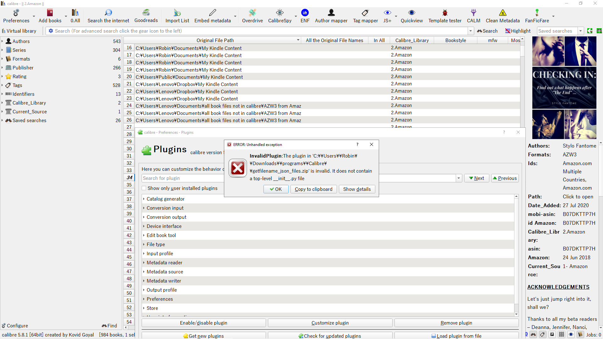 Must be something in my 64 bit 5.5. So, I renamed getfilename.json to *.json.save, redid the plugin configuration, and then added a book - y ahí tienes, it worked fine I am attaching the getfilename.json & getfilename.json.save files. BR |