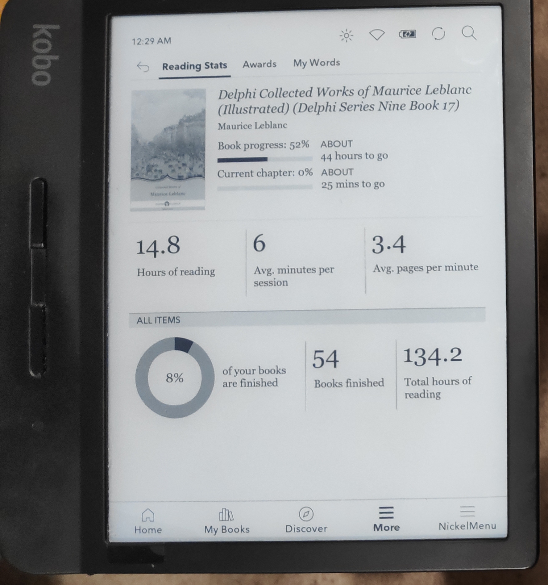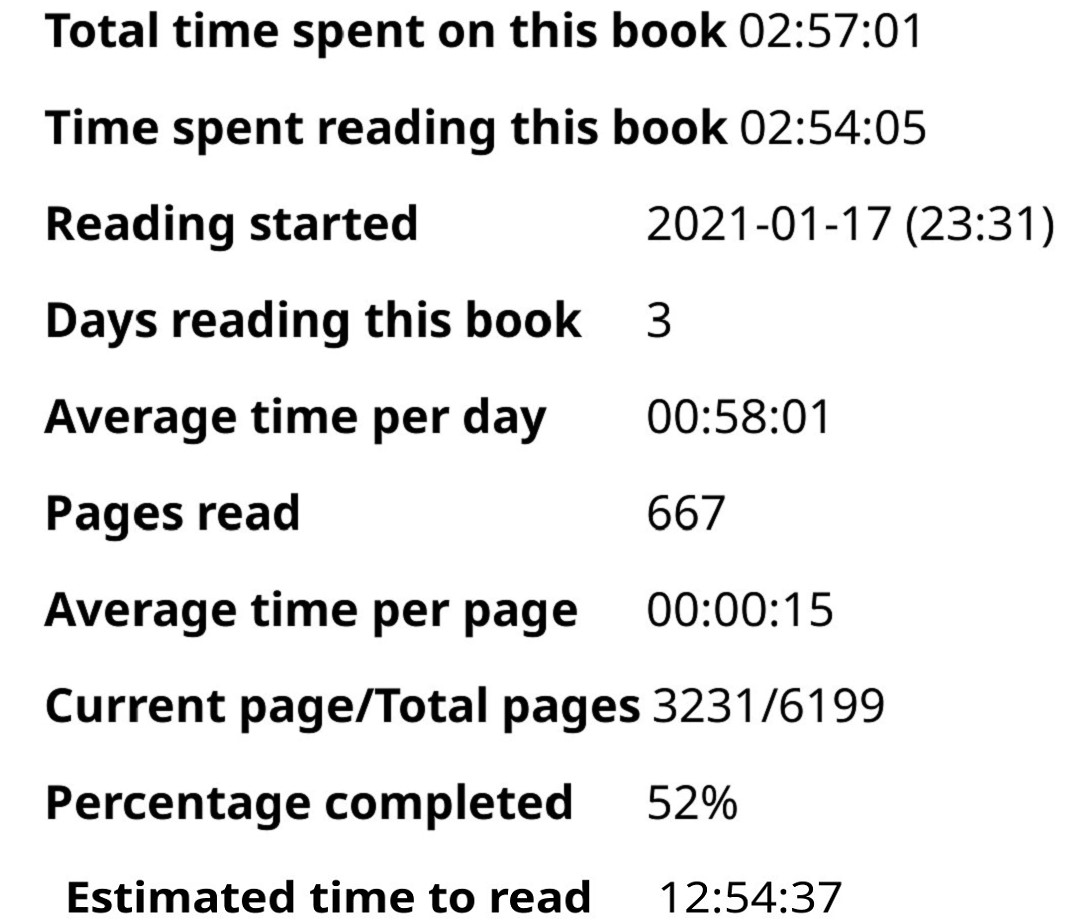 In the attached shots, Kobo's click per minute count is pretty much spot on. But if that rate is used to calculate the time remaining, the answer should be 16.8 hours, not 44. The KOReader stats are MUCH more accurate. At exactly 4 clicks per minute, the time taken to finish the book should be 12.366 hrs - VERY close to KOReader's estimate, very much unlike the Kobo count. The book is Calibre converted kepub too, so it's impressive that KOReader counts and extrapolates so much more accurately than does Nickel. |