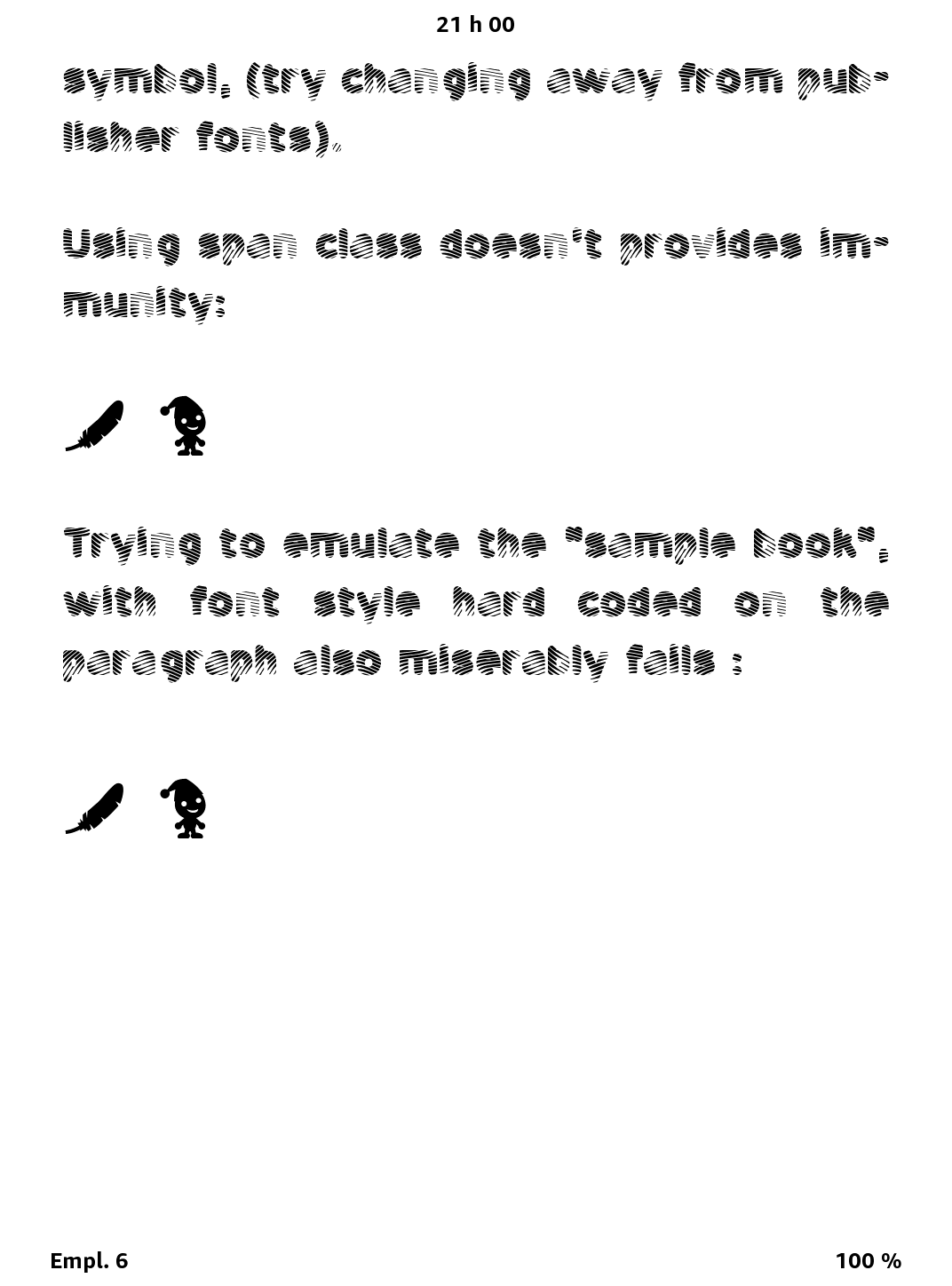 I converted your "fontlocked" book to KFX (after fixing some problems with the OPF) and it works as desired. The special symbols are shown no matter what font the user selects. (The file is attached.) Last edited by jhowell; 01-28-2021 at 06:24 PM. |