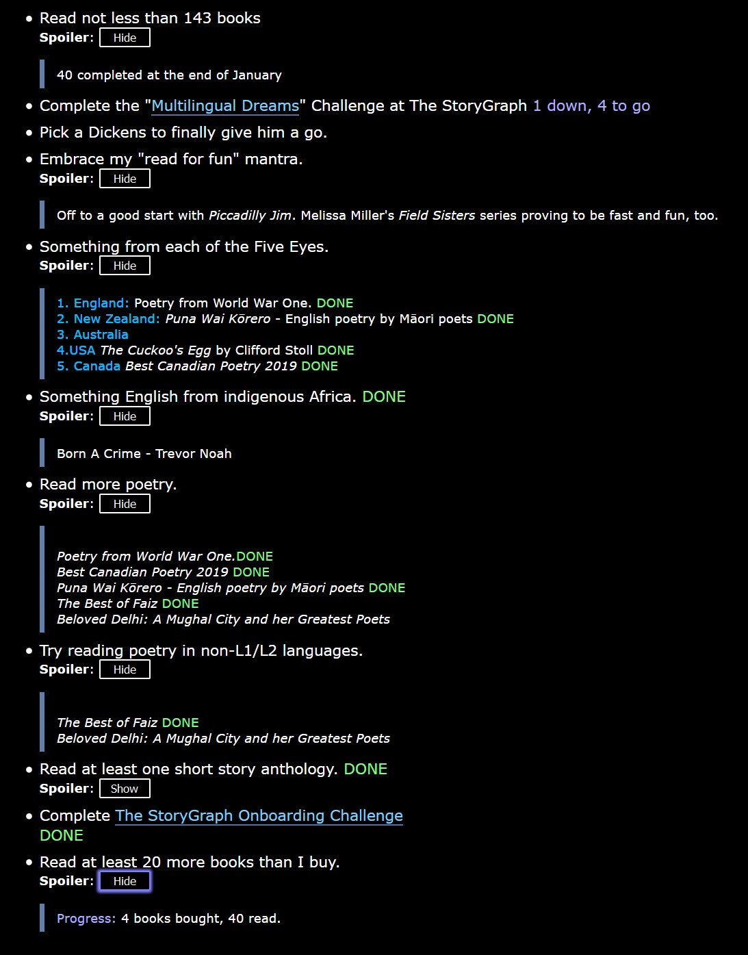 With January more or less done, my Reading Challenges, both here and The StoryGraph, are well under way. LOVE the detailed colorful stats at the StoryGraph.