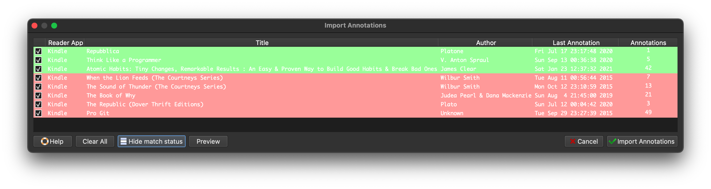 A complication to this is that the title and authors for the entries in the "My Clippings.txt" file are from the metadata in the books. When the plugin tries to match to the books, it is using these details. That could give some errors. If the above doesn't explain what you are seeing, I need to see a debug log. Turn the debug option on in the plugin's configuration and run calibre in debug mode. Post/send the log and the "My Clippings.txt" file with some details of what is missing. Or you think is wrong. |