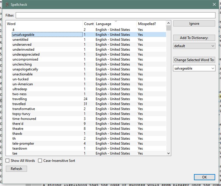 If you change Mode to "Regex", you can use Regular Expressions. In Regular Expressions, \b = a word boundary... so if you wanted to search for a whole word: Search: \bcolor\b Replace: colour Note: Regular Expressions are already case sensitive, so that won't match "Color" or "Colors". And since it's whole words, it won't match "colorimeter" or "technicolor". Alternate Method Your best bet will probably be Sigil's fantastic Tools > Spellcheck > Spellcheck. This allows you to search through all words in a book in an easy-to-read list. In there, you're also able to select a word, then "Change Selected Word to": Last edited by Tex2002ans; 01-09-2021 at 08:21 AM. |