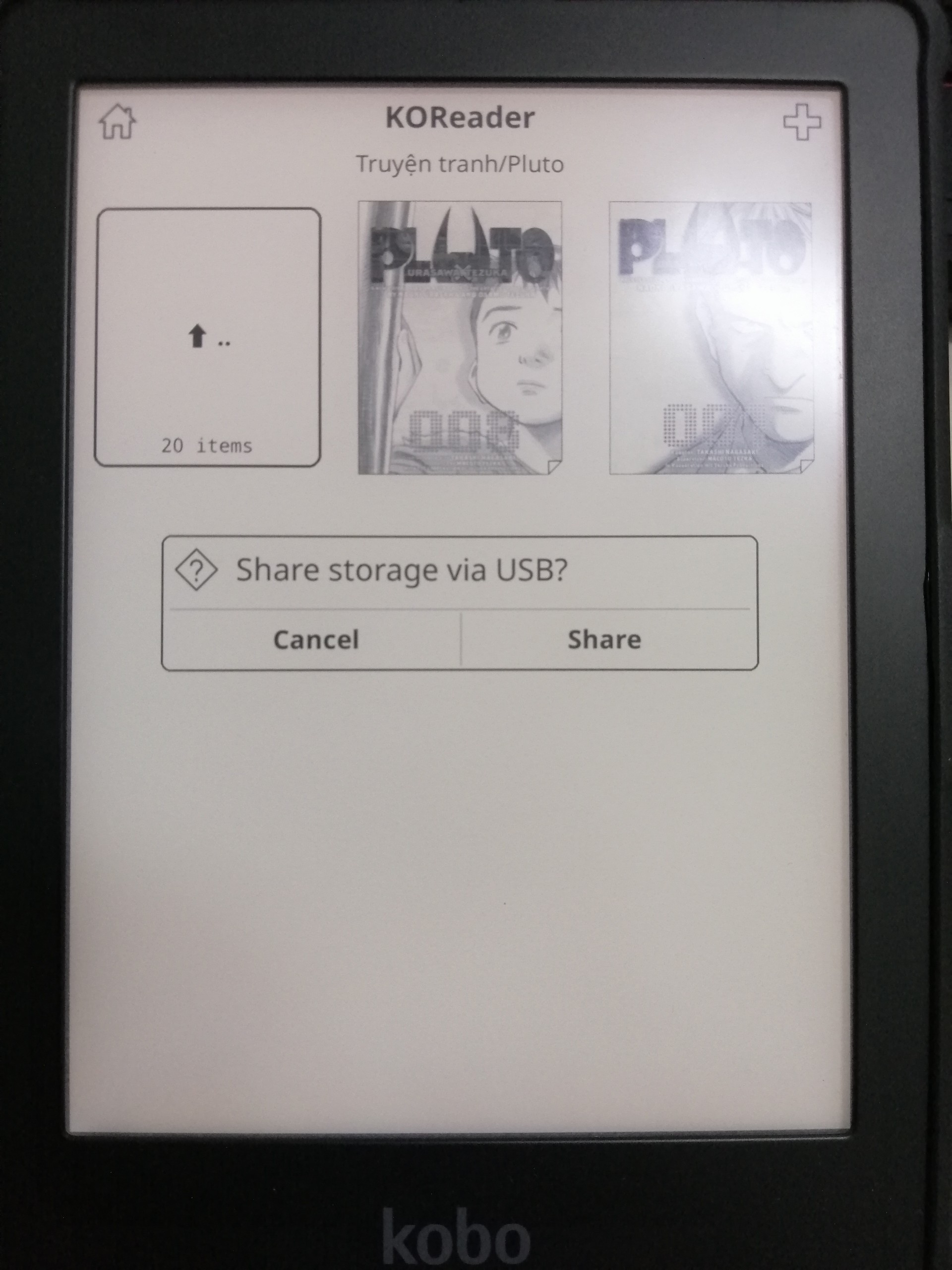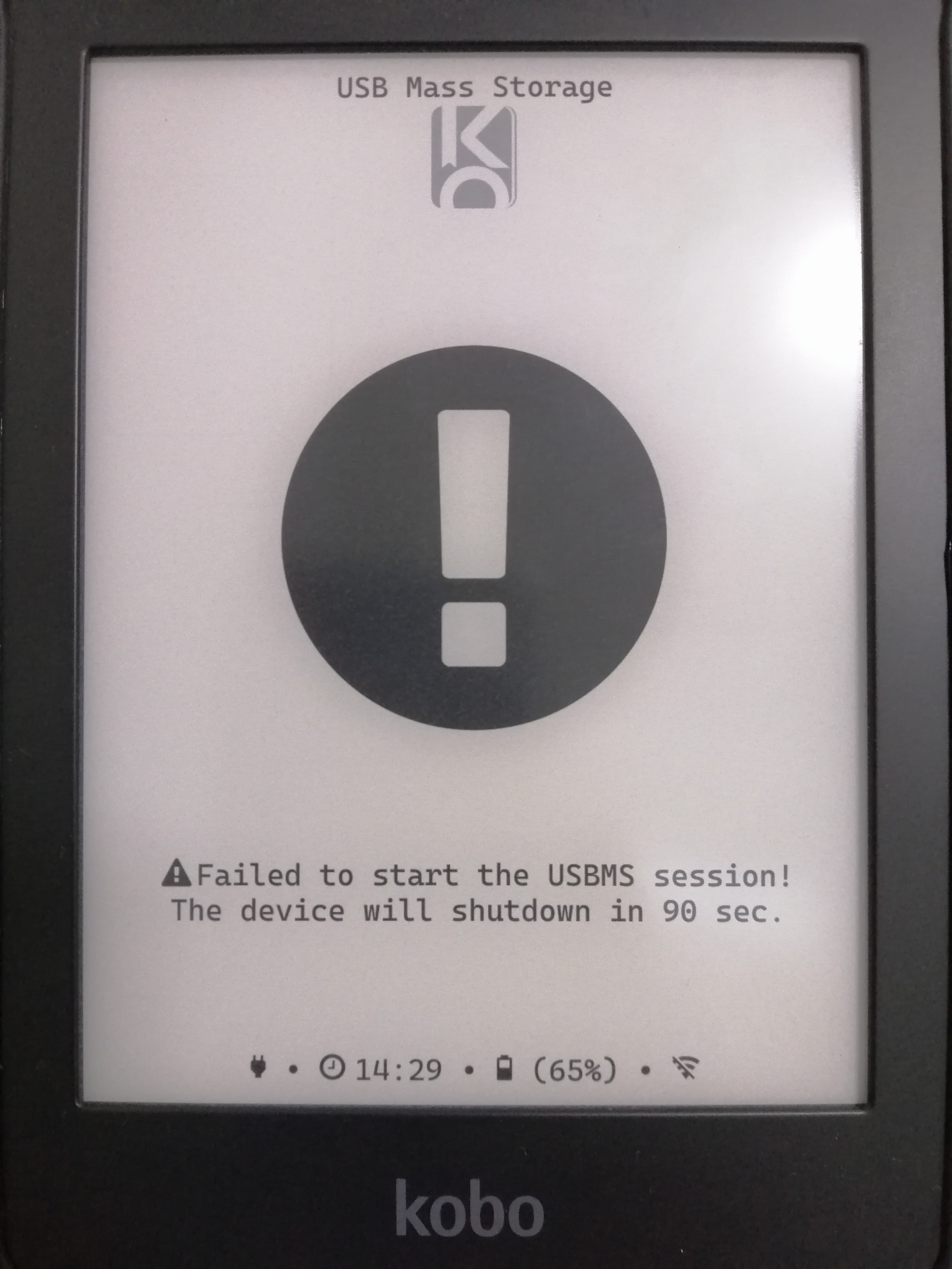I have a problem with usb mass storage.  - When I connect my Kobo to PC while using Koreader it has an error. First it showed the crash screen but now it only shows the error screen like below. (I've already exited Koreader and restarted Kobo) - And i also see that the new version of Koreader (Koreader version 2/2021- Kobo Clara Hd- firmware 4.26) is really slower than the last one i used (Koreader version 11/2020, kobo clara firmware 4.25). It takes more time to load the thumnails of my books, and to turn the page of my manga (cbz). The old version can turn pages immediately so that i can touch the screen continually, but now i can only touch to turn page per page. Thank you and sorry for my English. |