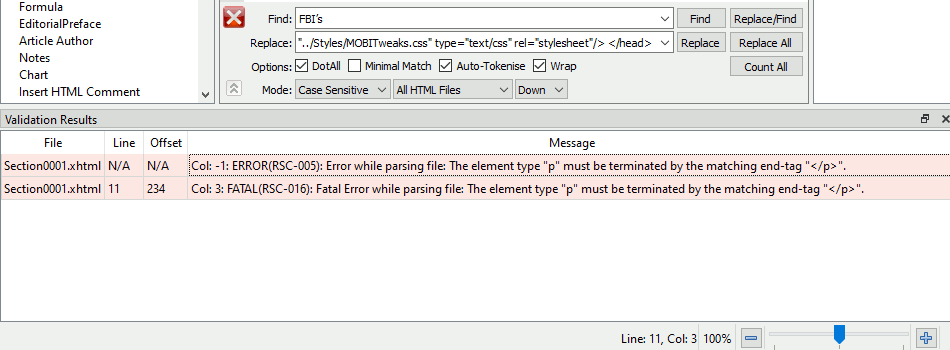 I know I wrote about that years ago... it's buried somewhere on MobileRead... lol. Some of the popups tell you exact filenames, but many just say there's a "not well-formed XHTML file" but don't tell you exactly where. For now, a workaround I do is run Doitsu's "EPUBCheck" plugin. This points out exact filename + usually gives you a more accurate picture: You can also double-click to jump to the location in the file. Quote: