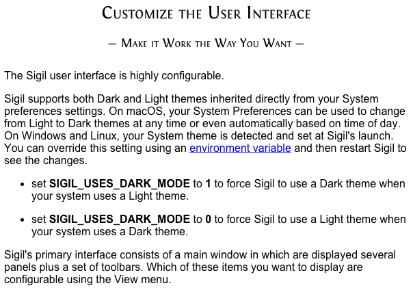The final version of the Sigil User Guide is now available: See the first post for: Sigil_User_Guide_2021.03.15.epub It has also been added to the Sigil master docs/ folder and of course all changes have been pushed to our sigil_user_guide repository on github. See https://github.com/Sigil-Ebook/sigil...guide/releases for official user guide releases One final question for your feedback: Since the current Sigil User Guide is only in EPUB2 format that does not accept added Accessibility improvements as well as an EPUB3 version could, should future releases of the Sigil User Guide be converted to the EPUB3 format (adding in Accessibility roles) but include a backwards compatible NCX and Guide. I think this is the way to go forward, but wanted to hear people's thoughts before making that change. Thanks again to all who helped! |