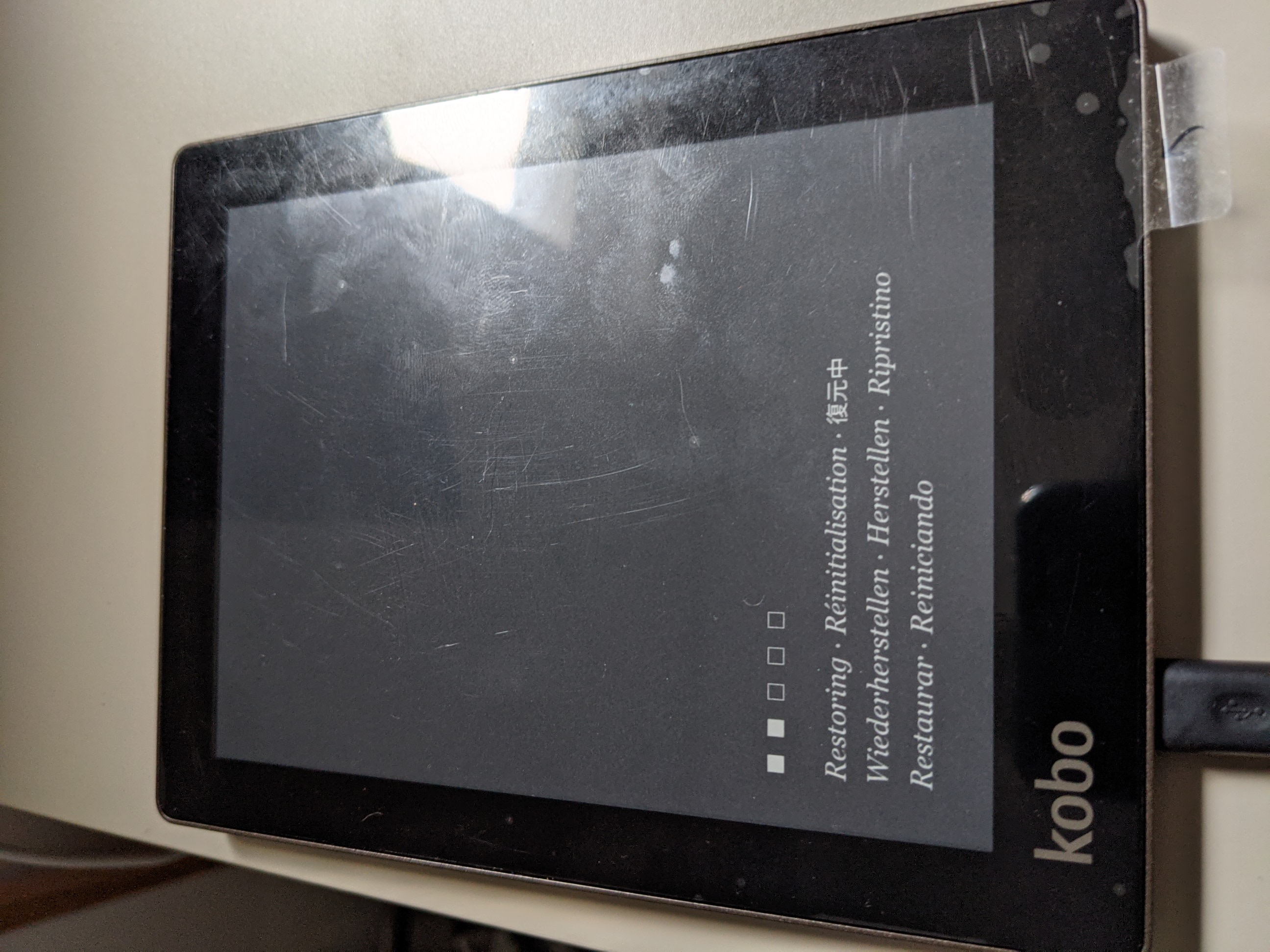 Forgot to mention the orange light flashes and the "reading" dots appear when kobo is connected to a PC or plugged to a charger. Once disconnected is freezes. Last edited by nick84; 03-14-2021 at 07:09 PM. |