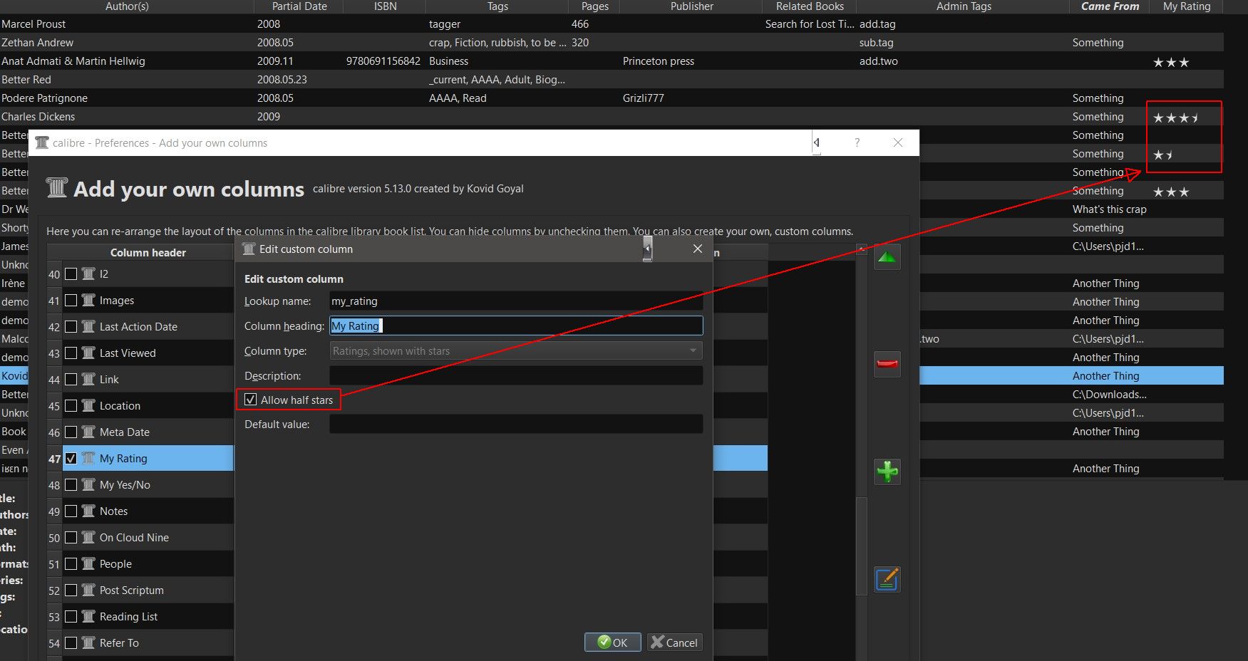 Now that's the part I've never been able to figure out. The custom 'Rating' column was a no brainer once Kovid showed me how, but every time I experiment with adding other custom columns I fail miserably. I'm just not savvy enough to fill in the fields correctly I guess, and there's no visual examples for a dummy to refer to for each type of column. At least I couldn't find the subject within the Calibre Help pages. I don't suppose you could give me a screenshot of what an 'Integer Column' setting looks like in the 'Add Column' menu.....? ![]() Thanks, Frizzell |