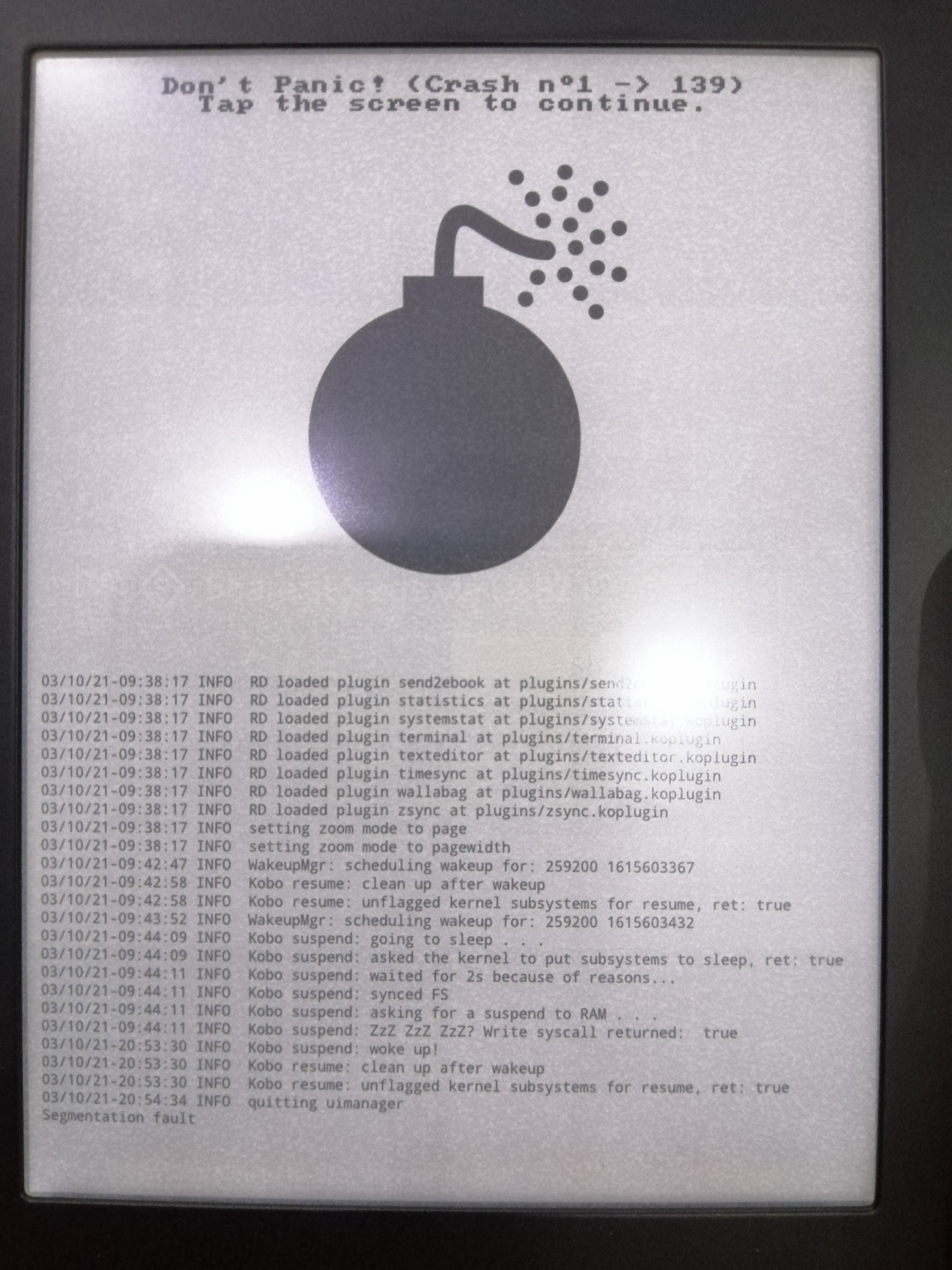 ).I can't tell you anything without verbose logs, system logs, and eventually a strace (c.f., https://github.com/koreader/koreader/issues/7340) .@HoanPiTa: Wrong thread. And check GitHub, this has come up, like, four times in the last couple of days. |
