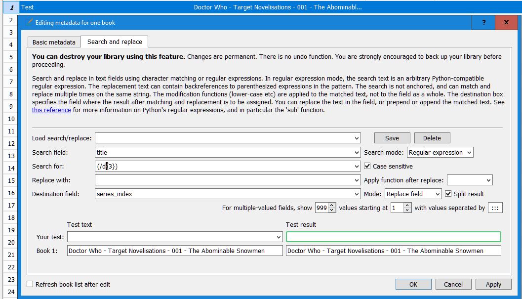 "Doctor Who - Target Novelisations - 001 - The Abominable Snowmen" I wanted to use bulk edit / search & replace to split the title into other fields Title = "The Abominable Snowmen" Series = "Doctor Who" Number = 1 The Series part is easy since the Basic Metadata tab has a place Is it possible? Last edited by phossler; 04-04-2021 at 09:51 PM. |
