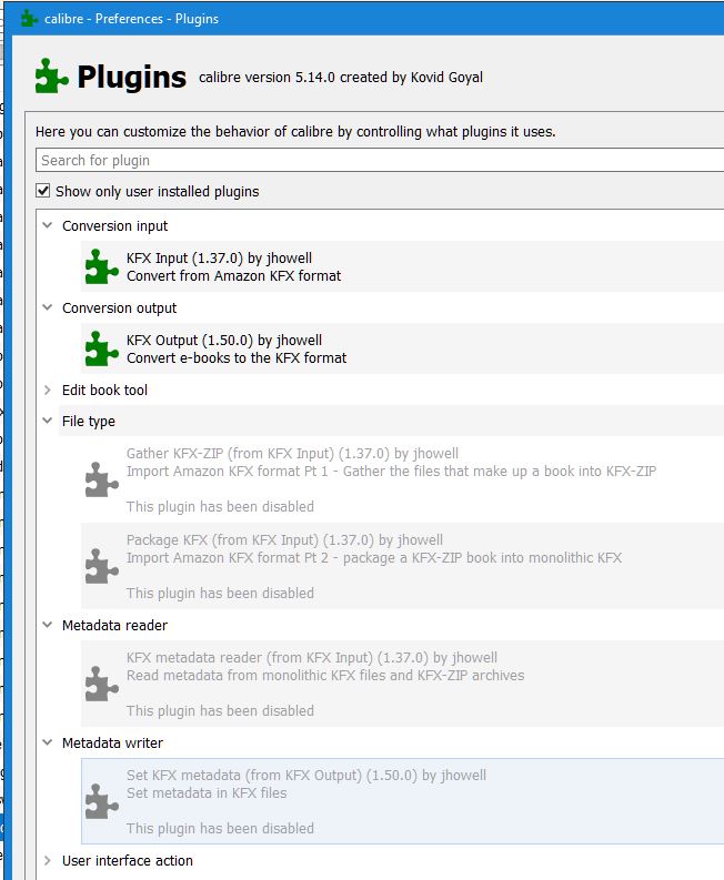 ![]() It appears that 'worker' PIs that are part of the main PI can be disabled. I don't know if that's a good thing. The KFX input and output PI each have helpers that can be individually disabled However, I still think that the UI for [Get Plugins to enhance calibre] should be internally consistent: [Uninstall] or [Install] as appropriate, [Customize] enabled if available |