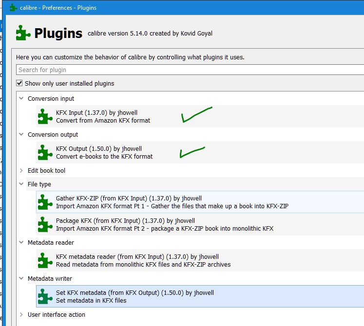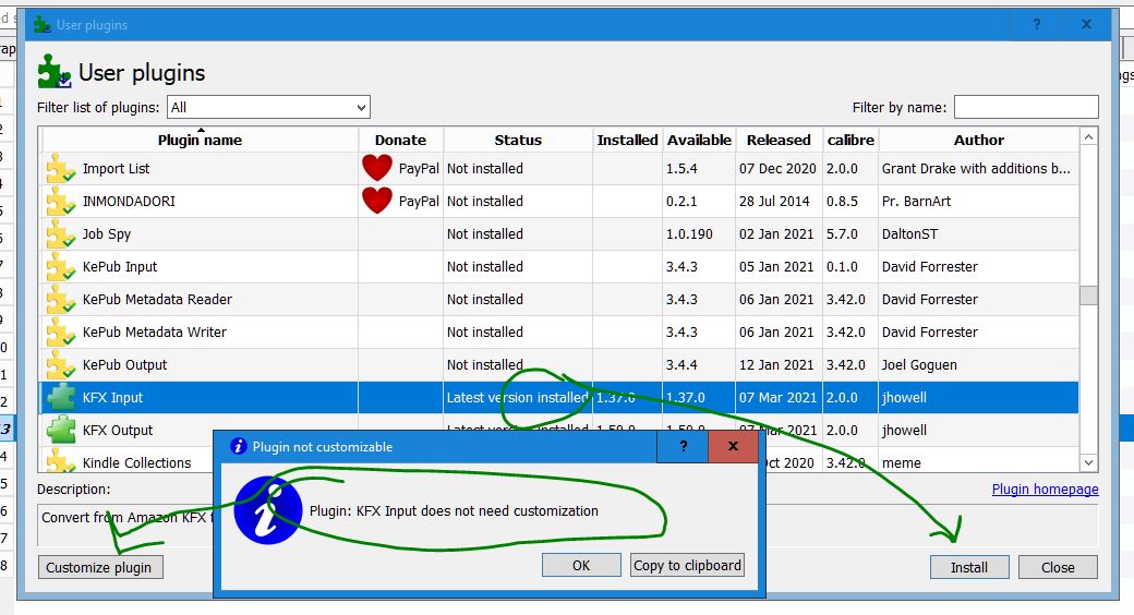 I probably used the wrong terminology, and I really didn't want to mess about too much by trying different things I got as far as the attachment below, which looks like some components of the KFX PI's could be disabled. I was worried about the effect that might have on the main PI's The gist of my first comment was that using the [Get plugins to enhance calibre] path, the button captions were (to me) a little misleading, in that an installed PI selected had a button captioned "Install" and that the Uninstall was on a right-click The last time I used the Preferences path to install a PI was long ago when I had to load a PI in a Zip (I think) Last edited by phossler; 04-09-2021 at 12:27 PM. |