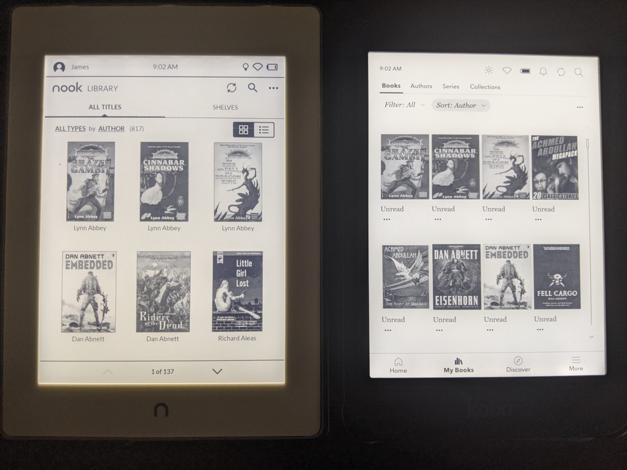 Anyway, on the Nook, stacking can be turned on and off. If the software were updated and you had the books stacked and list view on the author tab, you would have what you have now. If stacking were turned off and you used cover view, you would have what is already shown in My Books - Sort By: Author.