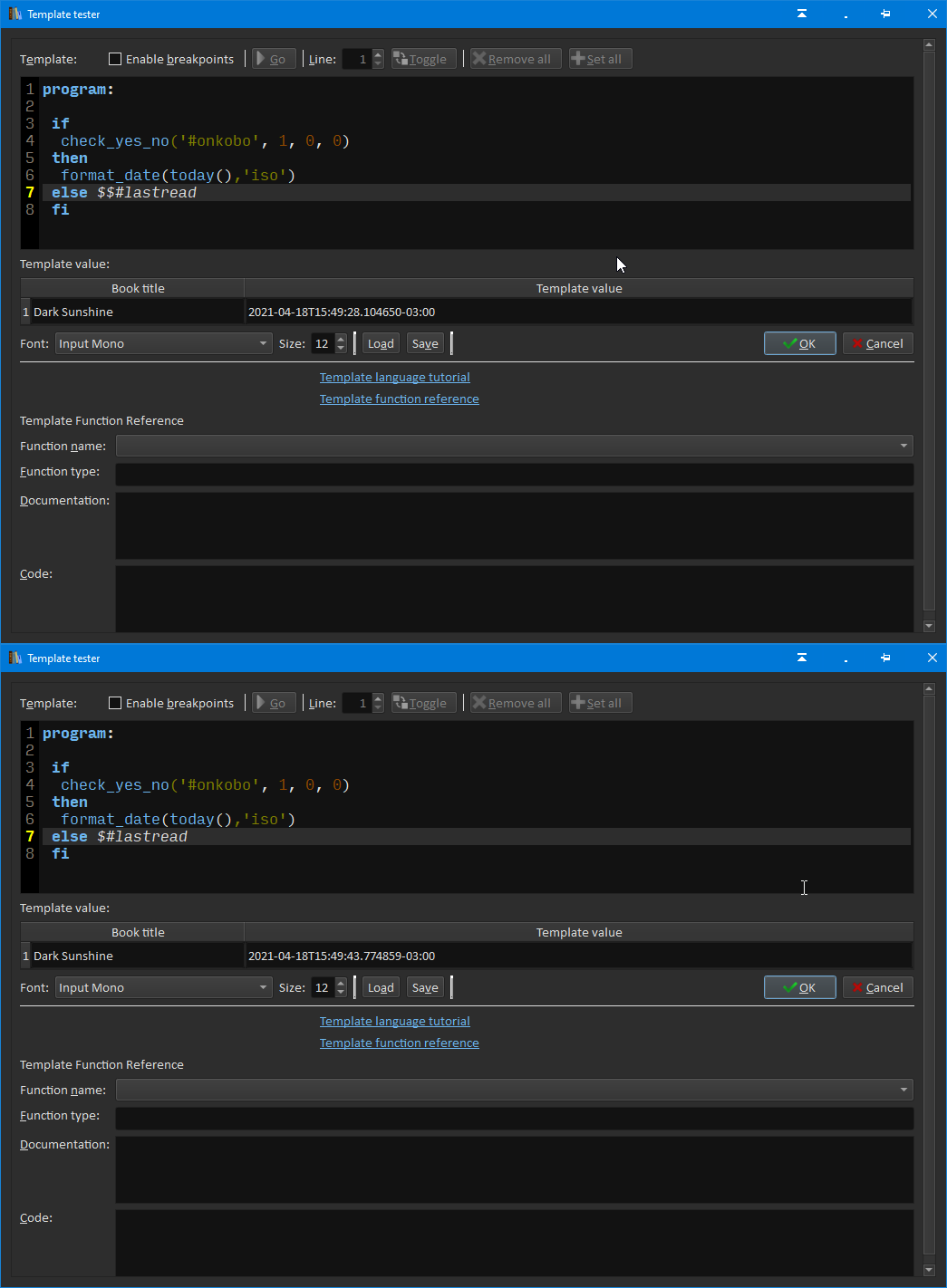 program: if check_yes_no('#onkobo', 1, 0, 0) then format_date(today(),'iso') else $$#lastread fi However, changing $$#lastread (raw field) to $#lastread in the else statement changes it slightly. Why does this occur? edit: wait, I think it's because time elapses... Last edited by ownedbycats; 04-18-2021 at 03:00 PM. |