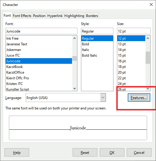 Actually many of the fonts I have the Features button in Styles simply lists the font name, but I see on junicode it does show loads.