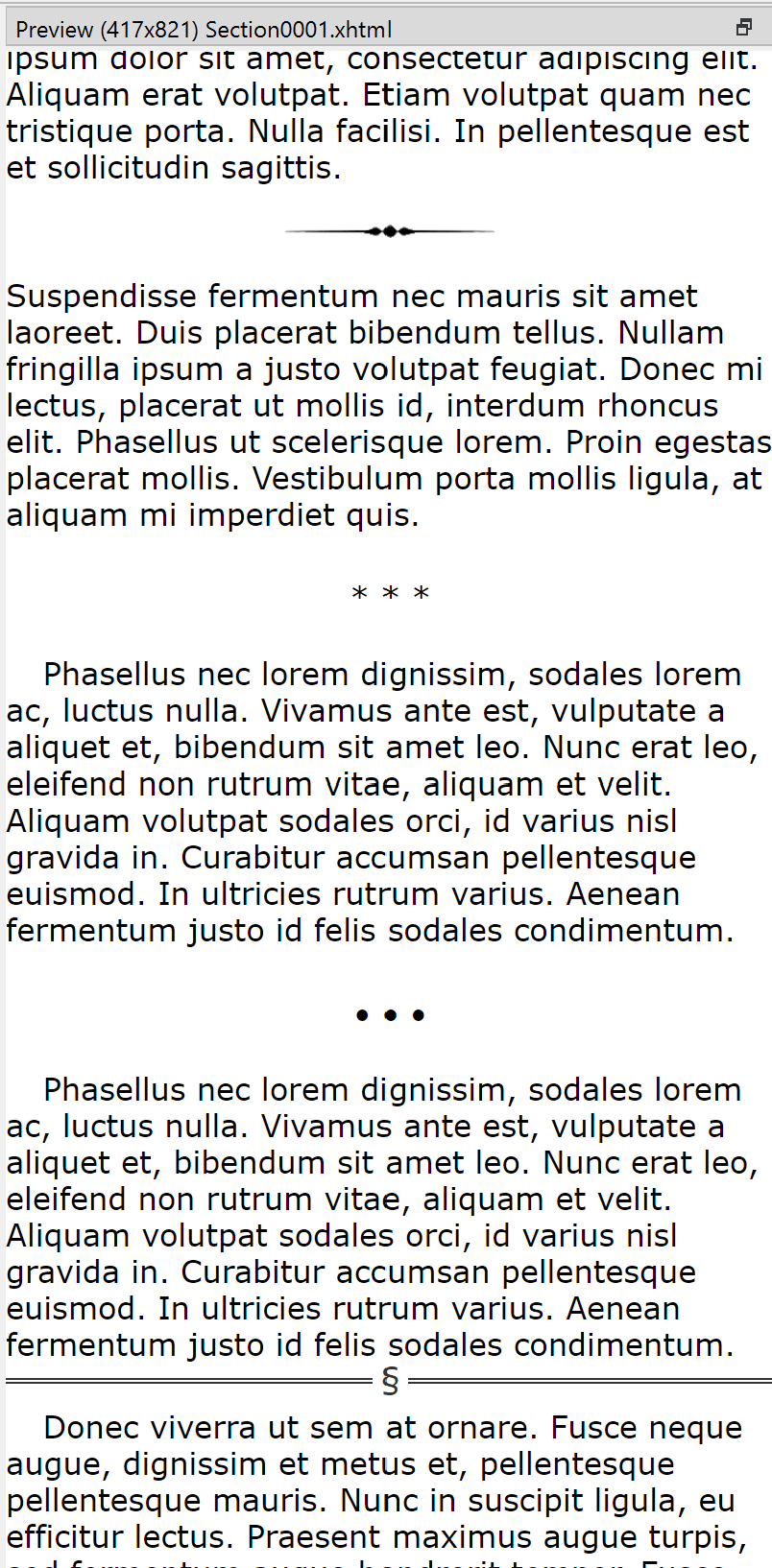 I also use the <hr/> to denote scene breaks. Apparently, that is the standard for assistive technology to determine scene breaks (or at least it was when I read the article last year...) It is possible to fancy-up the <hr> to include a fleuron, or asterisks, not just a horizontal line: Code: