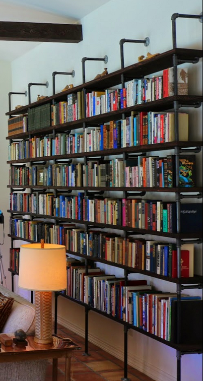 The first is a pipe and board floor to ceiling bookshelf. The house has a high-ceilininged first floor and I'd like to take advantage of that. I plan to order the pipe from an industrial supplier.