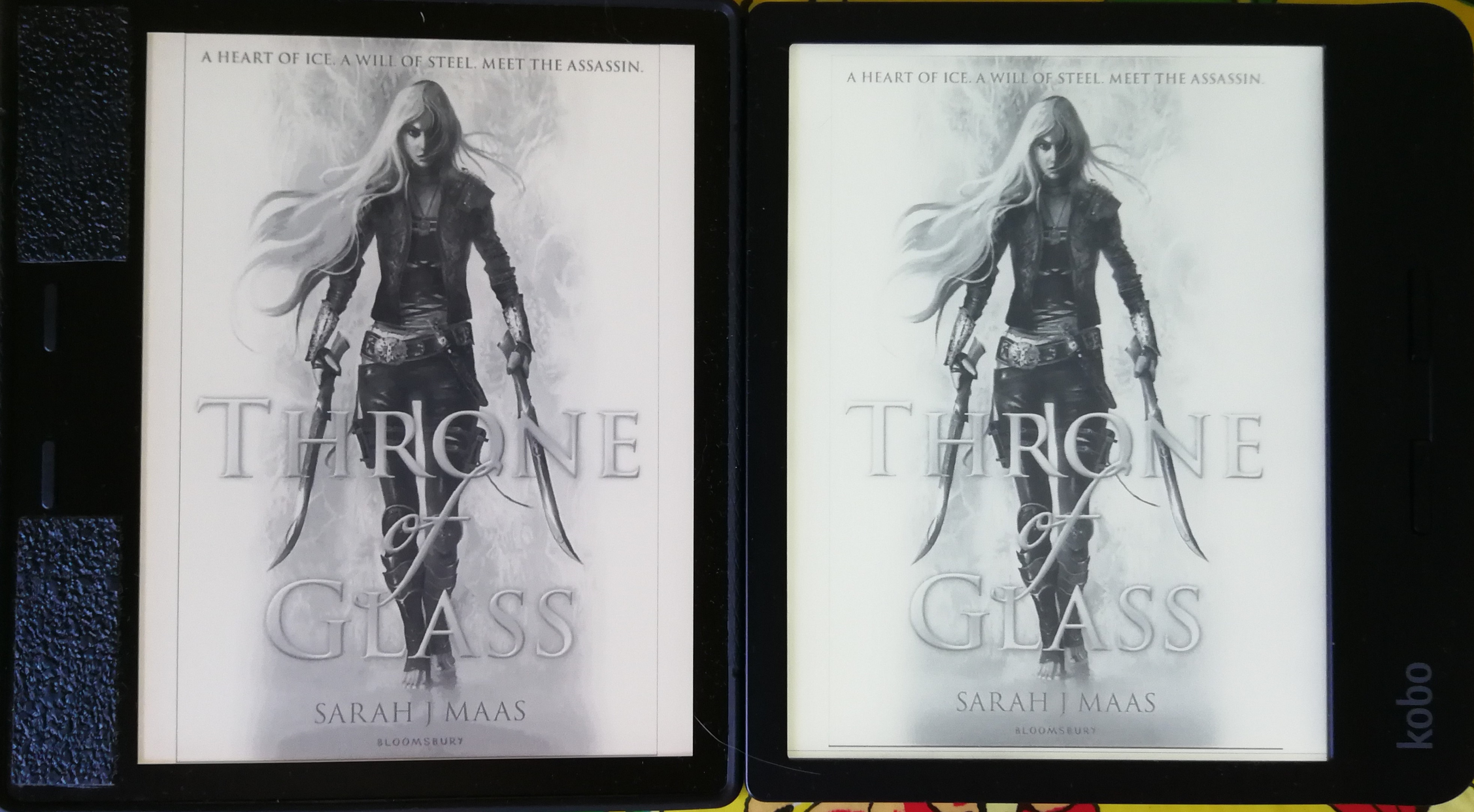 I took some pictures with my phone (I have no dedicated camera). The frontlight is more or less on the same level. No warm light. The font is Caecilia, with no weight added (with other fonts the difference in contrast was even bigger). The books are sideloaded from Calibre in azw3 and epub (The Wheel of Time is kepub). I have not modified the photos in any other way than rotated, straightened and cropped.