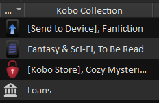 I also use a custom "On Kobo" column and make very heavy use of column icons: Here you see a fanfic I need to update on my device, a sideloaded book from another store, a book from the Kobo Store, and a book borrowed from Overdrive (I keep records for them so I can keep track of what I've read).