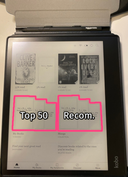 I'm not using the Kobo store and I don't think it counts side-loaded books. That said, it displays a (random? I currently only have one as I'm testing things out) collection there now, so it's not that bad. Last edited by vintodrimmer; 07-12-2021 at 06:35 PM. Reason: Proper image (hopefully) |