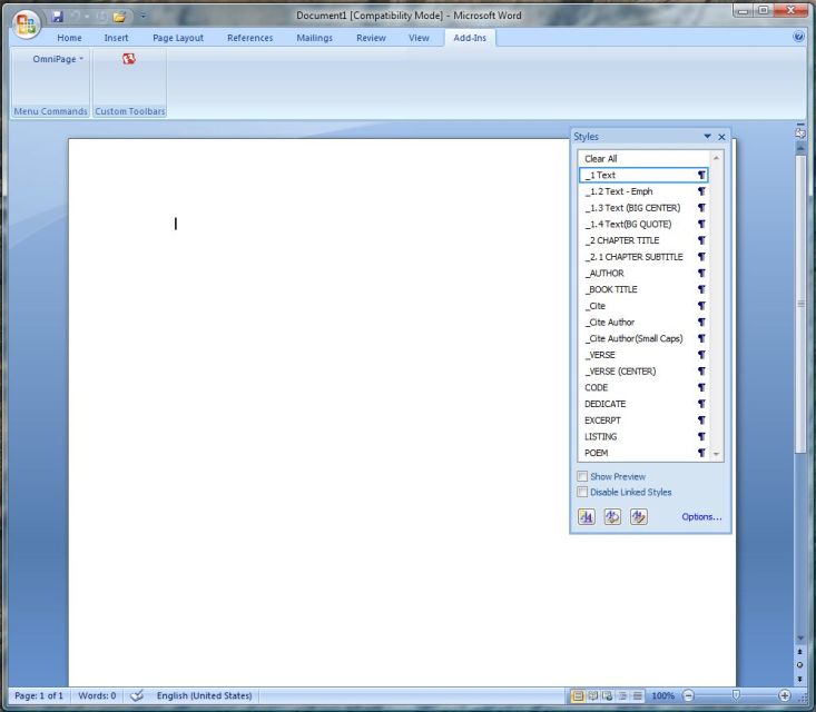 I wish I could help but I don't have Word2007. MY did take some screen shots of how BookCreator looks in word 2007, here is a link courtesy of MJ. https://www.mobileread.com/forums/alb...pictureid=1074 His album is https://www.mobileread.com/forums/album.php?albumid=122 =X= |