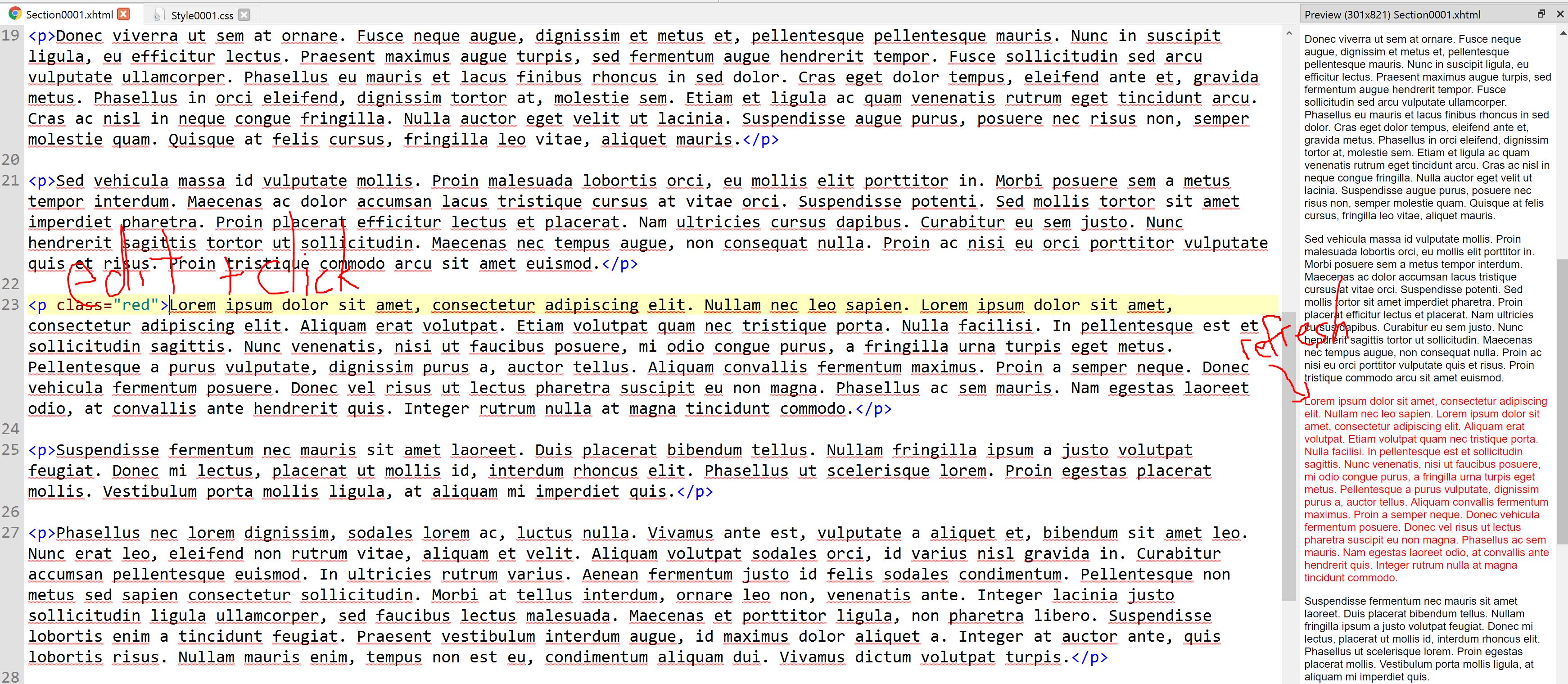 ![]() I just confirmed that the other part is still present in windowsx64 version 1.7 Easy steps to replicate what I was talking about before: - Open an html file that is "longer" than your preview window - Preview displays the top of the file (img1) - Scroll the code view down a bit; such that the preview will reposition when you click in code view...and click in code view - Preview updates such that the point you clicked on is roughly in the middle (vertically) of the preview pane (img2) So far all of this is normal and expected behavior. - Now edit the code view...either by changing the text (such as adding a space), or deleting/changing a class/style, etc. - Preview "refreshes" and the point you were editing is no longer in the same position (vertically). Most often - for longer chapters - the position you are editing is no longer even visible in the Preview window. (img3) - If you mouse-click on the same position you just edited, the preview window refreshes again putting that point roughly in the middle (vertically) of the preview window. (img4) The same thing happens when you click on the style sheet tab, or ctrl-click on the class name. The Preview window will "refresh" to some other position - most often, for longer chapters, to a point where the position you were editing is no longer in the preview window. (img5) When you make a change to the style sheet, the preview window will do a "double refresh"(???) It will flash to show the point you were changing, but then immediately refresh again to show the same (wrong) point it had previously. This makes it slightly difficult to see the effects of your css edits until you go back to the code view on the html sheet and click on the point to re-sync the preview pane. |