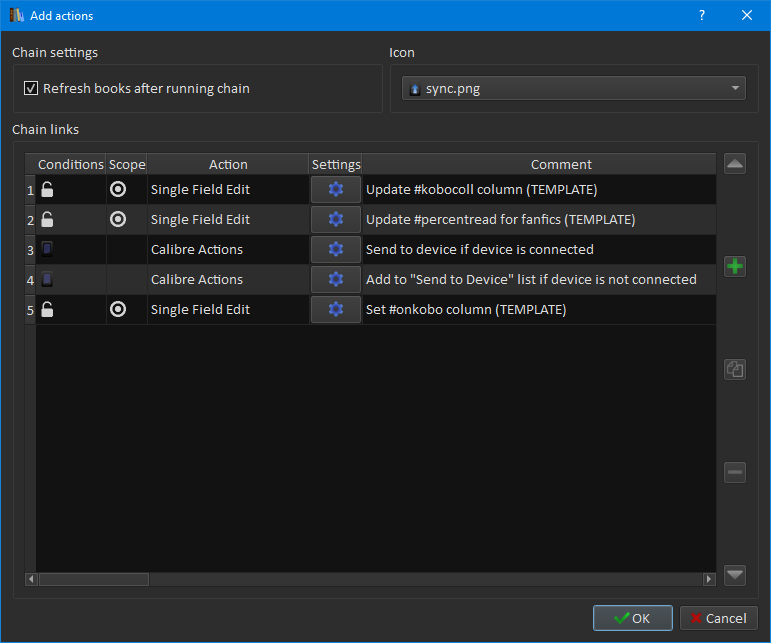 So I have an action chain to either send directly to device (if connected) or add to the send-to-device reading list (if not connected) and then set the #onkobo boolean - y is on device, n is on device but not up-to-date (fanfics with new chapters), undefined is not on device. Last edited by ownedbycats; 08-14-2021 at 01:44 AM. |