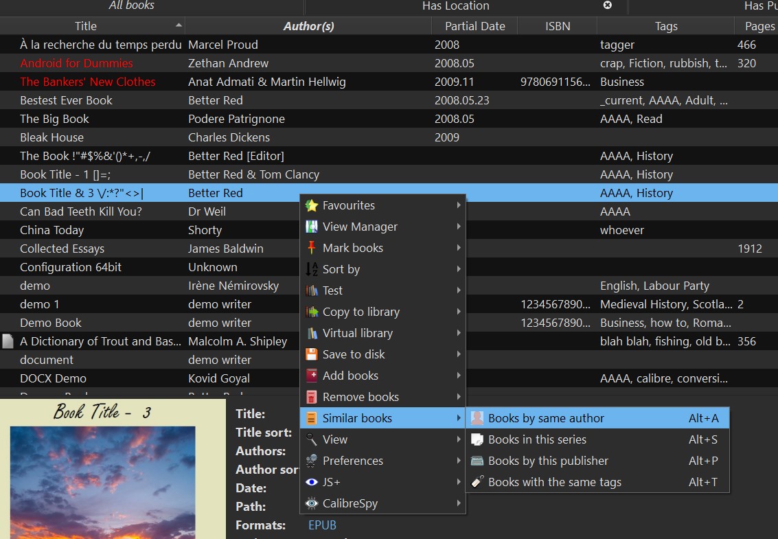 Will look at this tool but I don't think it will be useful for what I'm doing right now. When I download new books, I usually just leave them in a folder until there quite a few of them and I have the time to work with them. When I'm ready, I bring all of them into a temporary library; there I fix the author names and titles and the respective sort fields; I convert them to epub; and insert their page numbers. Then I copy all of them into my main library. Once in the main library I gradually add and edit their metadata - that's the function I was performing on each new book. Before, I was creating a virtual library by author so I ccould see all the books by the same author so I could check for duplicates, including books which exist in box sets. Using the tag browser proved to be much quicker than the virtual library technique and I shall be using it in future. However, I will take a look at the tool you suggested. I'm always learning about Calibre!! Thanks for the suggestion! Sparky |