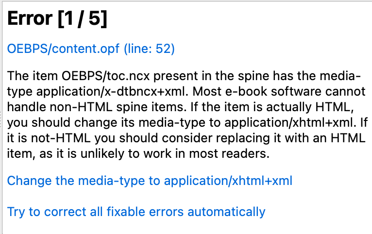 I'll attach screenshots below, but here's the situation: 1. The Check Book feature returns 1/1 Error, related to an incorrect namespace (attachment 1). I clicked on "Run fix HTML on this file, which will automatically insert the correct namespace." 2. Now it shows 1/40 errors, the top one related to an image being present more than once in the manifest (attachment 2). I clicked "Remove all but the first duplicate item." 3. Now 1/39 errors, and it says "The media type for the Table of Contents must be application/x-dtbncx+xml" related to Line 52 (attachment 3). For reference (this will be relevant later) the code in Line 52 is currently <item href="toc.ncx" id="ncx" media-type="application/xhtml+xml"/>. I clicked "Try to correct all fixable errors automatically". 2. After doing so, the code in Line 52 did indeed change in the way the error message indicated it needed to. But now there's a new error message: "The item OEBPS/toc.ncx present in the spine has the media-type application/x-dtbncx+xml. Most e-book software cannot handle non-HTML spine items. If the item is actually HTML, you should change its media-type to application/xhtml+xml. If it is not-HTML you should consider replacing it with an HTML item, as it is unlikely to work in most readers" (attachment 4). I have no idea where I'm meant to go with this. Now, I did not try stopping after Step 2 above, saving changes and trying to send the book to my Kobo again. Maybe that would work. But I thought if there were more errors I should try to fix them all, but one of them appears to be some weird Catch-22 that means nothing to me but probably does mean something to you. I should also add that I tried DNSB's suggestion of doing an EPUB-to-EPUB conversion without editing the book on another of the four, and that did successfully send the book to device. So maybe I should just do that with the other three and call it a day, but I was curious if David or anyone else has insights into what the error messages mean. I am at a deficit when it comes to understanding all but the simplest code, and this one has stumped me thoroughly! Many thanks for all your help. |