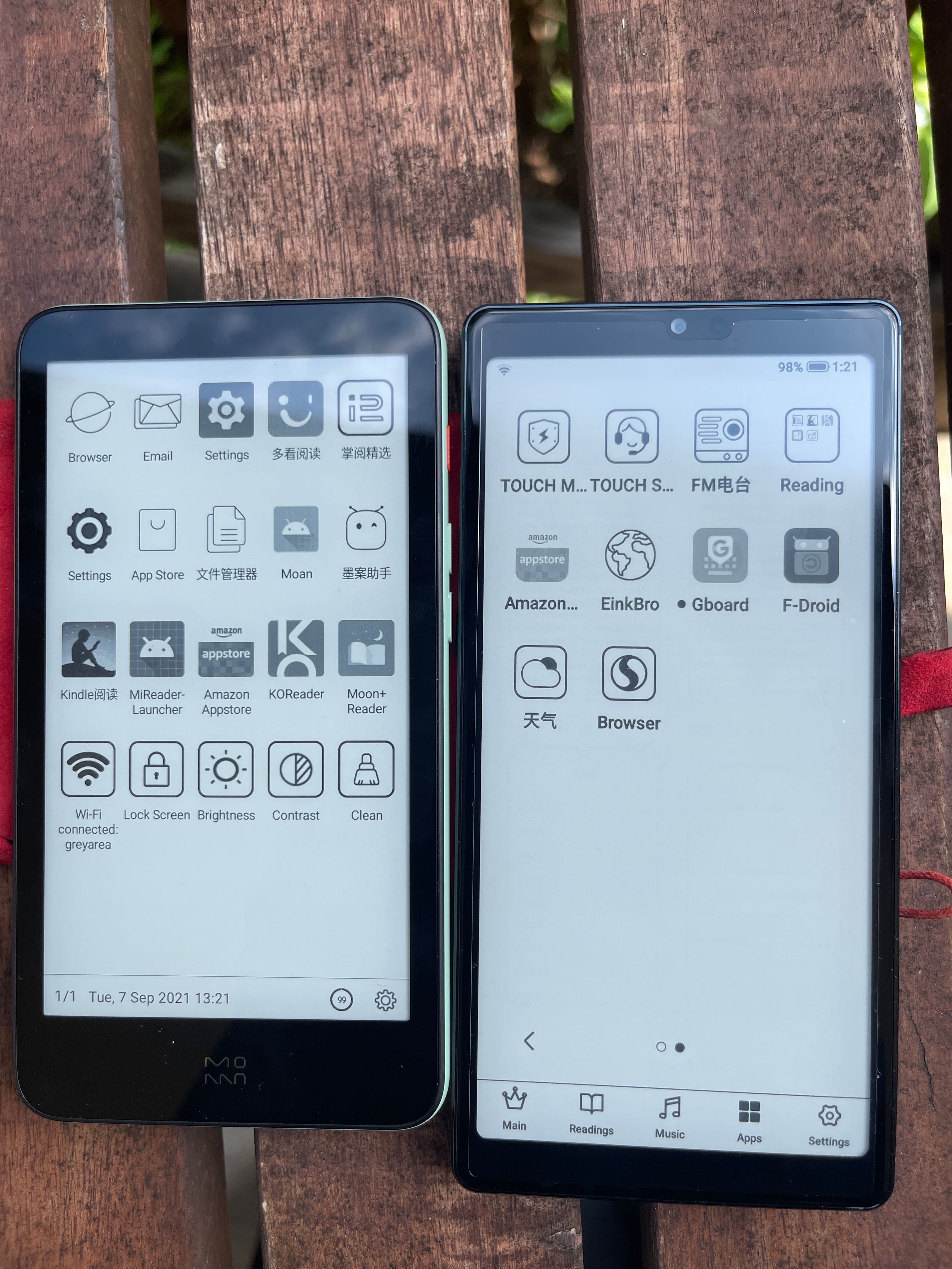 I ordered the mini 5, the case in green, two matte screen protectors and one tempered glass one from cect-shop. 1. Build seems good. Feels well put to together with a flush glass screen that's Glossy 2. The tempered screen protector I got is actually matte and that is great. I put on the tempered since it is matte then followed the instructions in this guide: https://github.com/philips/inkpalm-5-adb-english to get it in English then rooted using: https://github.com/qwerty12/inkPalm-5-EPD105-root and used magisk to install microg and einklauncher from: https://github.com/qwerty12/E-Ink-Launcher . I also installed the nice freeze app from: https://android.izzysoft.de/repo/apk...ayhi.freezeyou as recommended. Once you have the normal launcher you can get into a normal settings app to do things like change time zone and keyboards (I immediately ditched the sogou keyboard for gboard then removed the sogou one since I was not gonna put passwords into that thing), you will need to still use the moan app (launcher) to open its settings to change things like the lock screen wallpaper and code if you want. As well as the home button settings (logo button). I've been using moon reader plus fine and will probably ditch microg at some point as I don't need it anymore and don't plan on updating any of the apps I put on it with the play store since microg did not let me get my paid for apps anyways. Had to get modded versions of those in the end and sideload them. Things I wish we could get or add to the current rom: 1. better control of the logo (home) button so we could like triple press to get a real app manager that can close just some apps. 2. wish we could install the normal android nav bar so we could have that type of navigation. Thats beyond me though and I tried to enable the existing one like you normally would with ADB and I think the rom does not have the actual files in there. 3. if not get the stock nav bar then get a floating ball like app to work or something similar. Here are some pics showing the protector, it next to a note 9 in an otterbox and also a size comparison with my Likebook Ares Note (7.8") showing the same book in moon reader plus. |