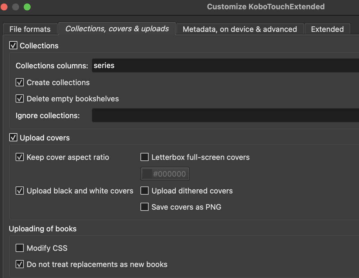 Go to Preferences > Plugins. Search for KoboTouchExtended (no spaces). Select it and click Customize Plugin. Then look in the Collections, covers & uploads tab.