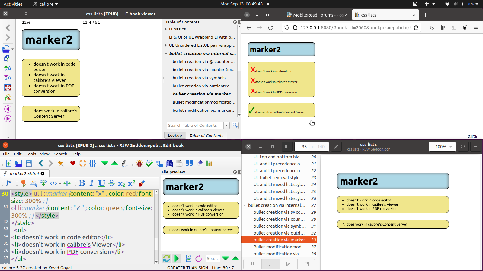 Previous post of mine months ago mentions ::marker not working and I periodically retry to see if it has been added. I stumbled on a new fact for me, in that it still does not work in calibre's editor, calibre's conversion to PDF, or calibre's Viewer, but it does work with calibre's Content Server.