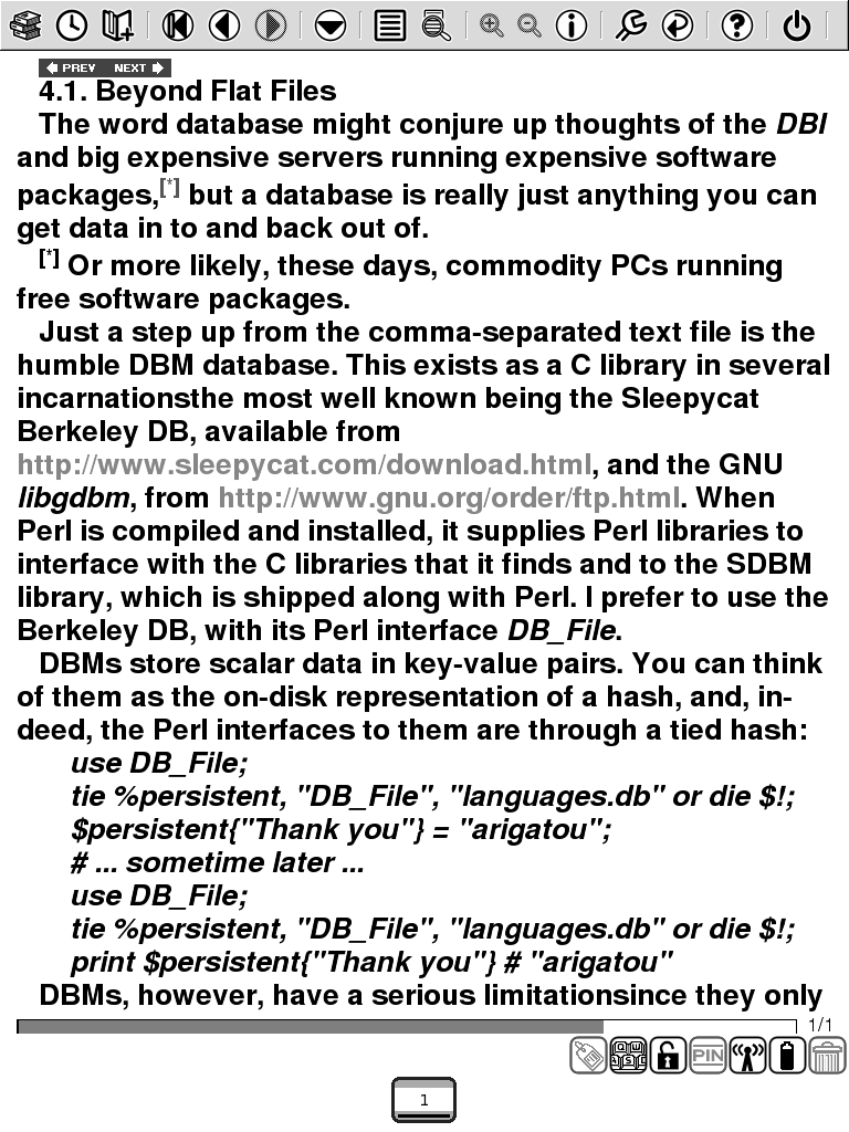 Here are screenshots of the CHM using FBReader on the iLiad. I use a large bold font, but this is user selectable with FBReader (which you can try on your PC). Navigation is easy using the stylus and FBReader allows for multi-level CHM TOCs. It does not handle code fragments very well (does not recognize preformatted text), as illustrated by the last screenshot.