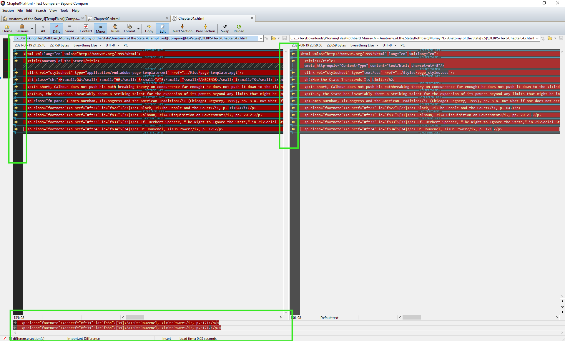 Note: One disadvantage though... Beyond Compare was meant more for actual code, where lines are small. So in ebooks, you can only replace "whole paragraphs" at a time. Fine if there's 1 simple change in a paragraph. Not fine if there's dozens, where I might want 9/12 changes. And everything is compared at the file-level... it would be nice to do something like: