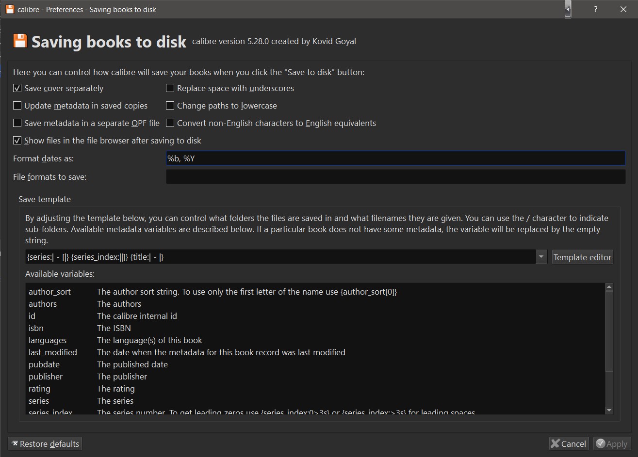 Option "Save cover separately" is activated. (sorry, I'm using non-English-Calibre, maybe different wording). But suddenly NO covers are exported, only epub and opf files. Problem is the option within "adding books": "read metadata from file content instead of file name". I get the covers only when I have activated this option! But then the prefs (saving to disc) are ignored, so the series number is not added. Much complicate, sorry, cannot explain it more simple. |